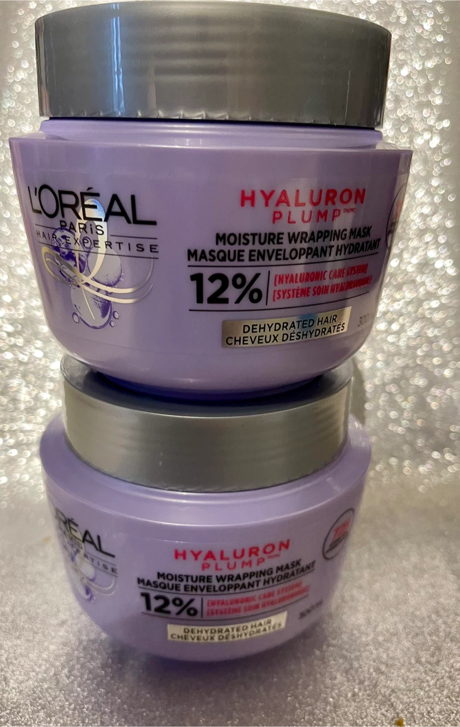 Selling set of (2) brand new L'Oreal Paris Hair Expertise Hyaluron Plump Moisture Wrapping Mask! It's designed for dehydrated hair and contains 12% hyaluronic care system. The mask comes in a 300ml container