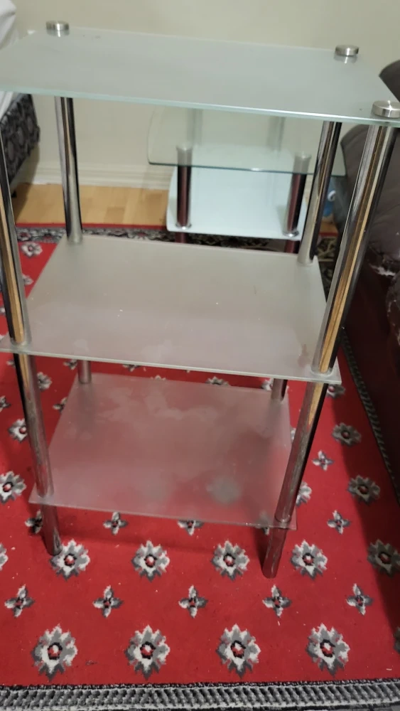 Selling a glass shelf table with chrome legs. It measures approximately 17 inches in length and 11 inches in width. Great for adding a modern touch to any room!