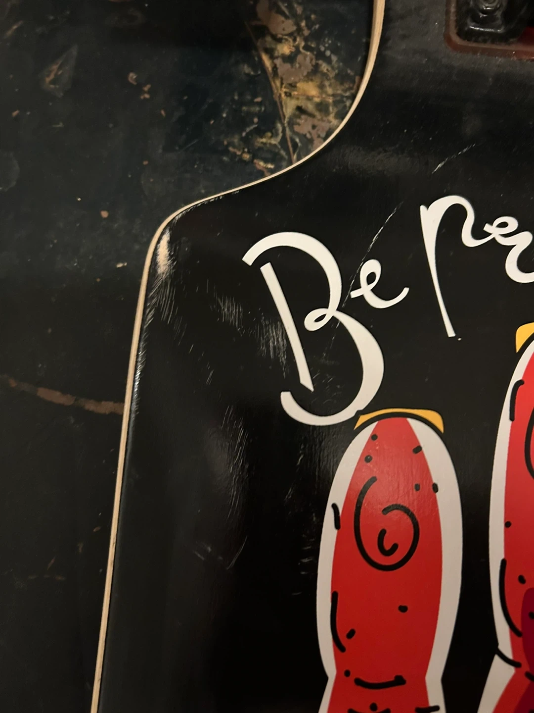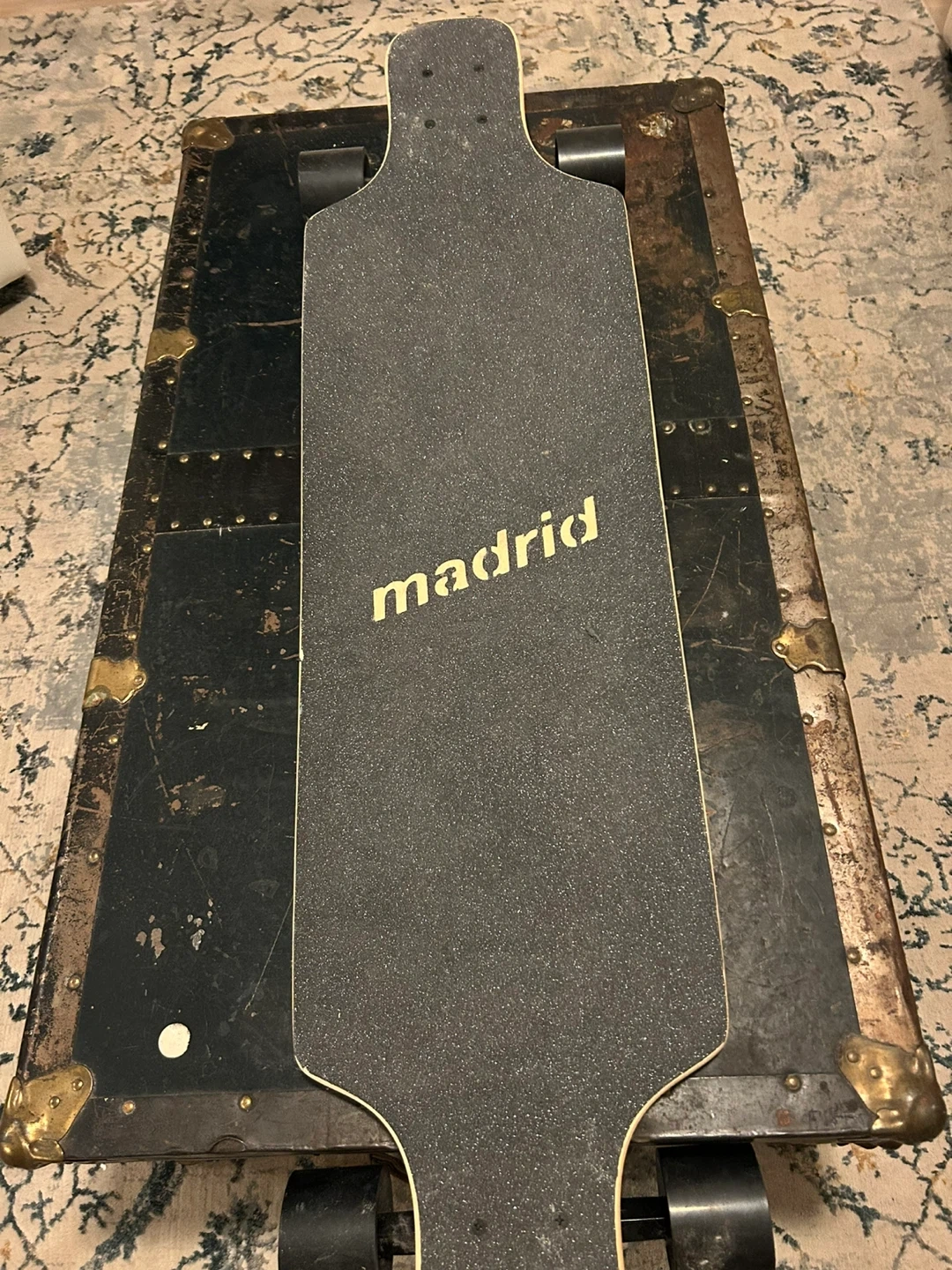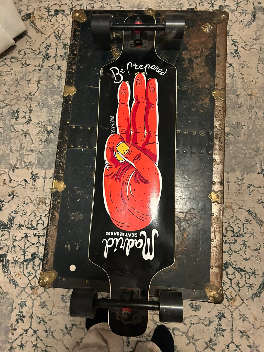 Selling a used Madrid longboard skateboard. It features a cool design with a hand graphic and the words 'Be Prepared'. There are some tiny signs of wear, including small scratches on the board, but it's still in very very good condition for riding. It was never on roads just tried in the house
