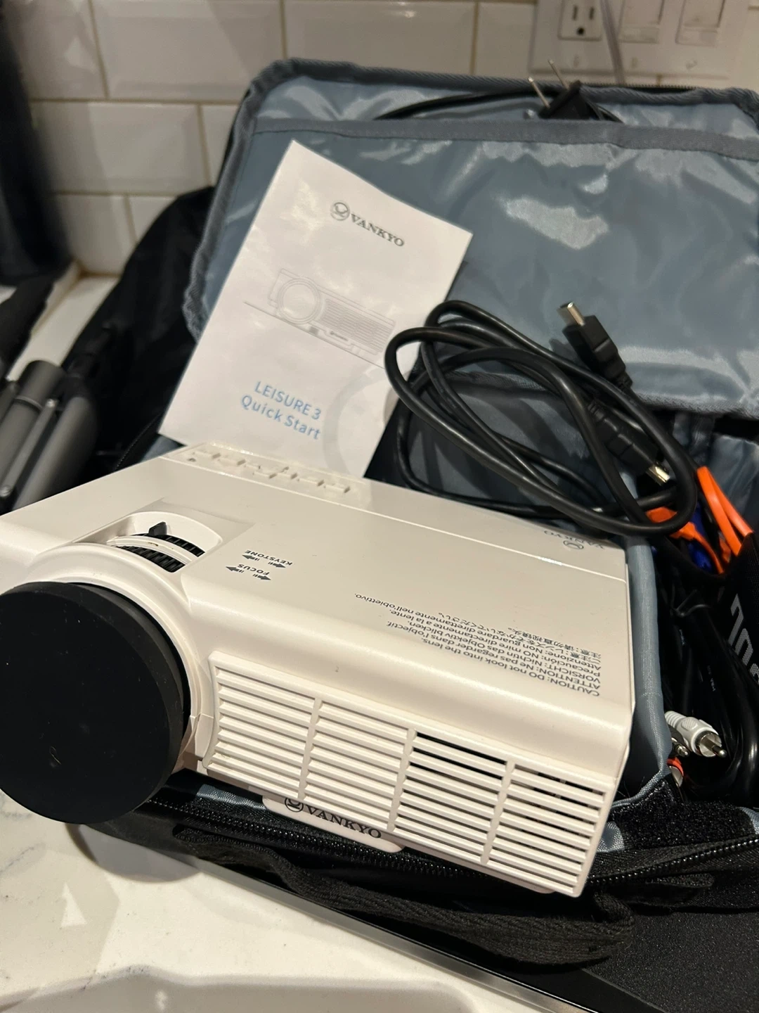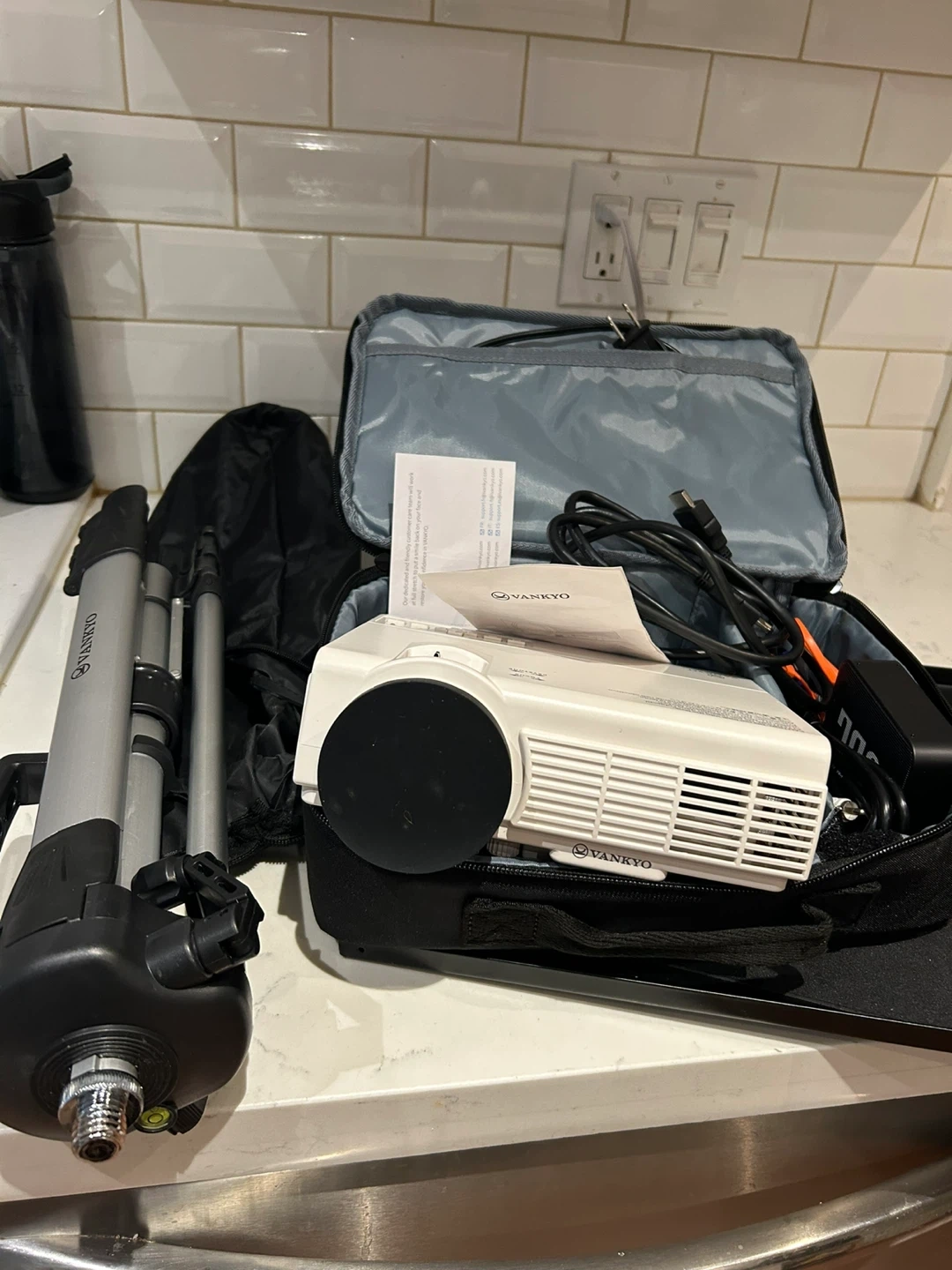 Selling a VANKYO Leisure 3 projector, complete with a tripod! It comes with all the components you need for a great viewing experience. The projector is in great condition and ready to use. Includes the carrying case for easy transport and storage. Used once during Covid