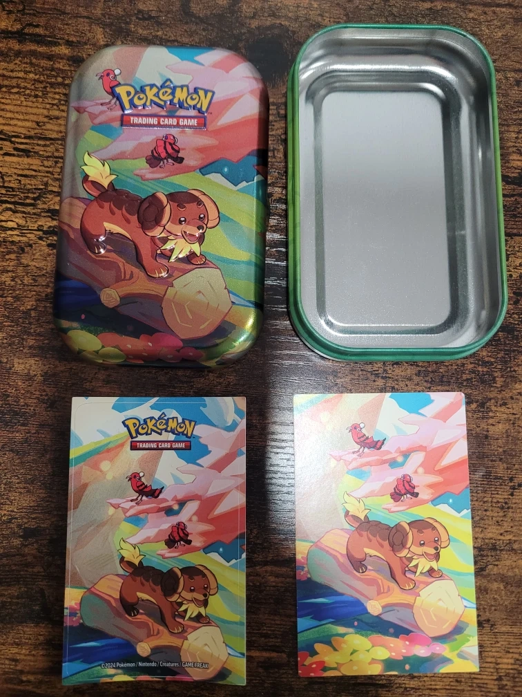 Selling a set of Pokémon Trading Card Game art card featuring Oricorio and Dachsbun, complete with a sticker and a decorative tin! The cards can be combined to create one big picture. Great for any Pokémon fan!