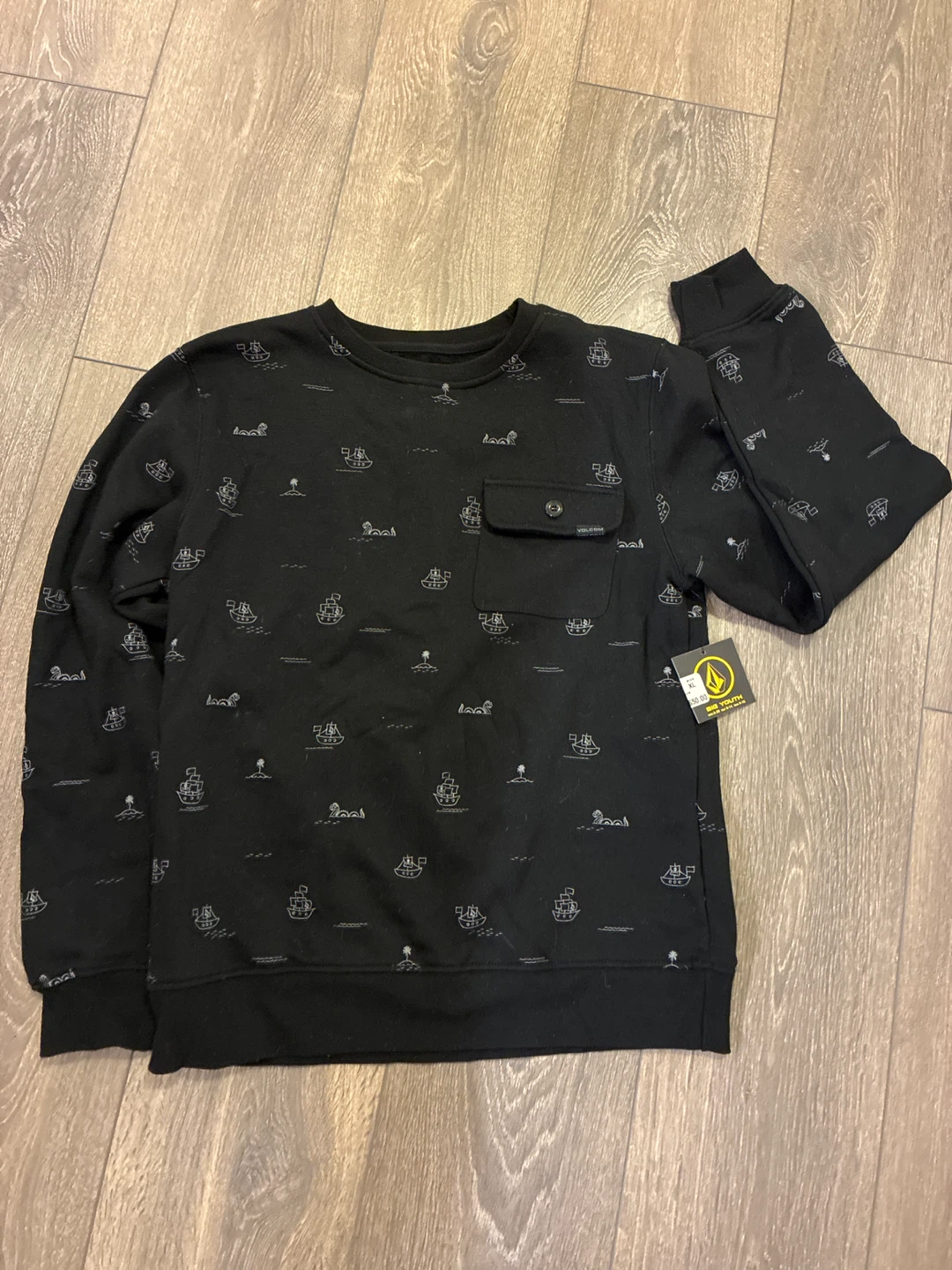 Volcom youth sweatshirt in size XL. It also fits an adult size XS/S. It's black with a fun pirate ship and palm tree pattern. Has a pocket on the front!