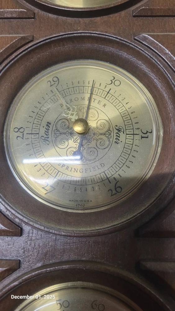 Selling a Springfield barometer, thermometer, and hygrometer combo unit. It's in good condition and would look great in any home or office!
