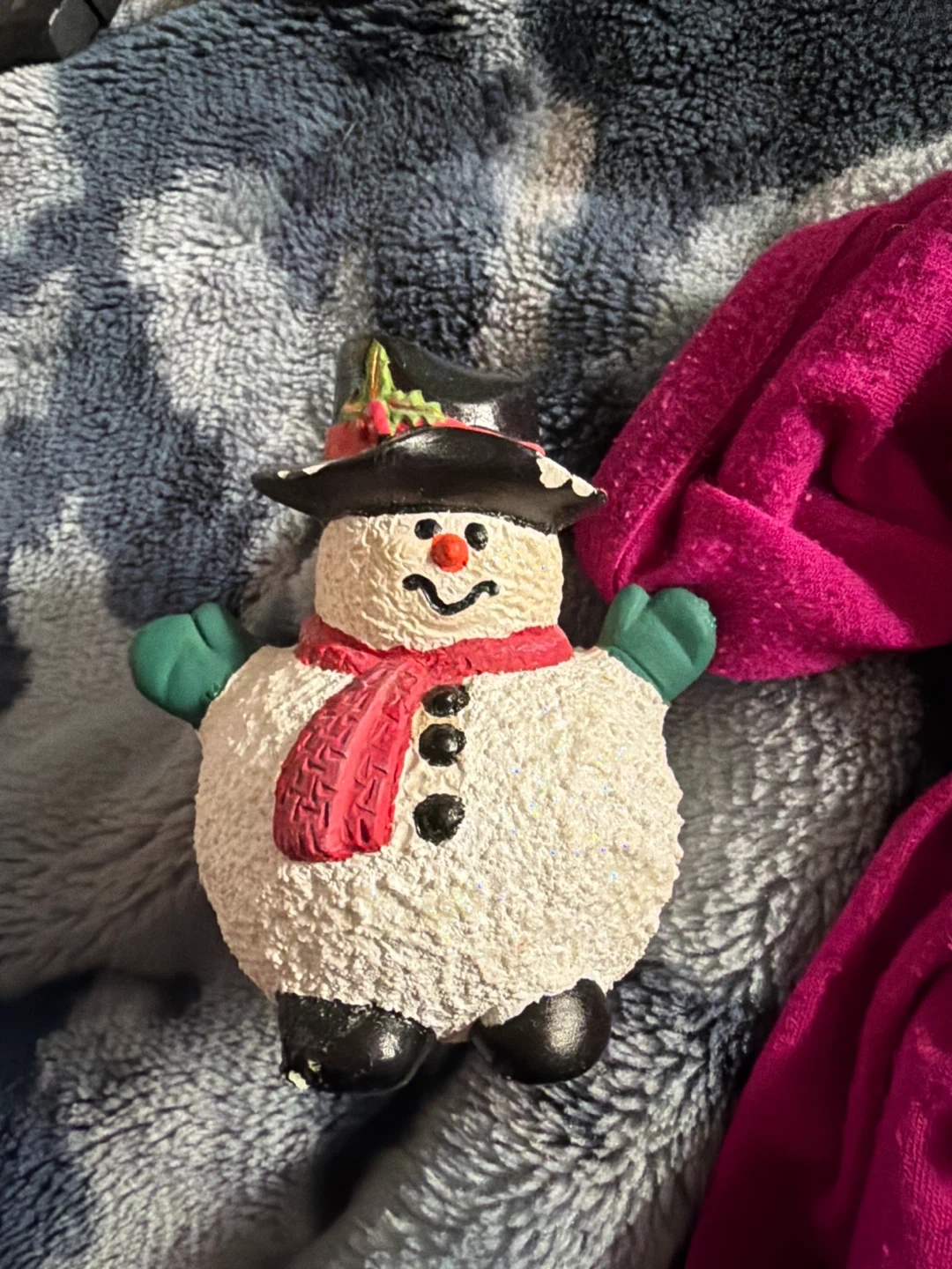 A cute snowman figurine, perfect for adding a touch of winter charm to your home! It has a black hat with festive decorations and a red scarf. It's in great condition and ready to brighten up your space