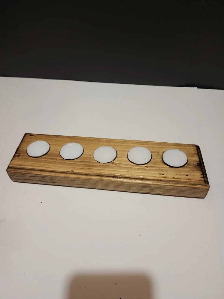 Here's a rustic wooden tea light candle holder! It's perfect for adding a warm and cozy touch to any room. It holds five tea light candles and has a beautiful wood grain finish.