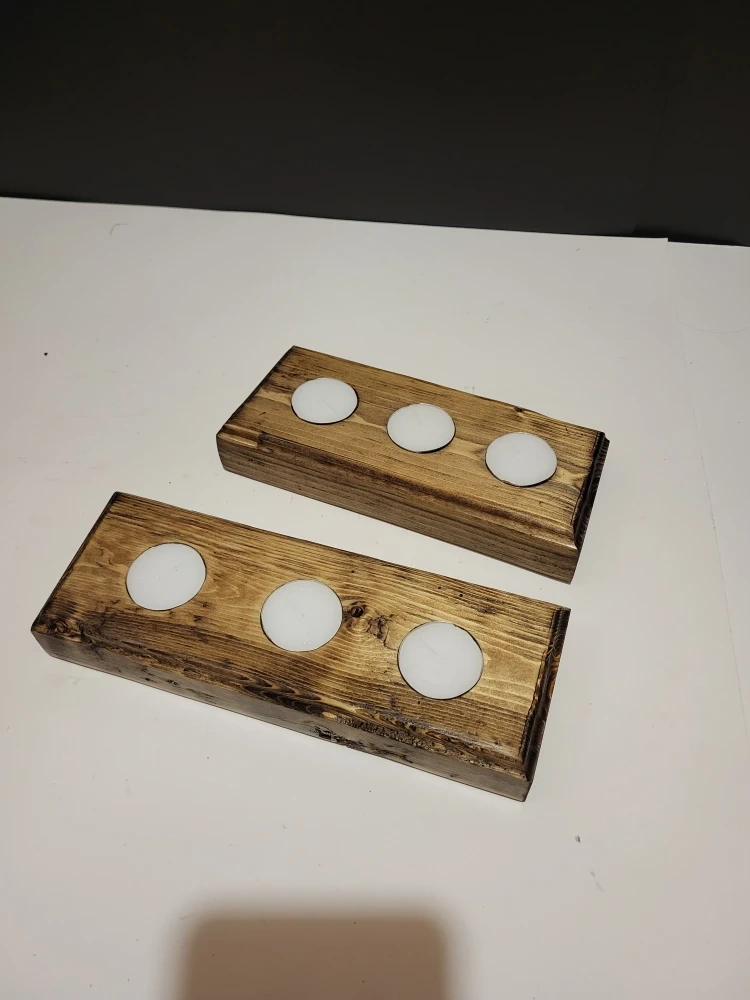 Selling handmade wooden candle holders! They have a lovely rustic look and can hold four tea light candles each. Perfect for adding a cozy touch to any room!