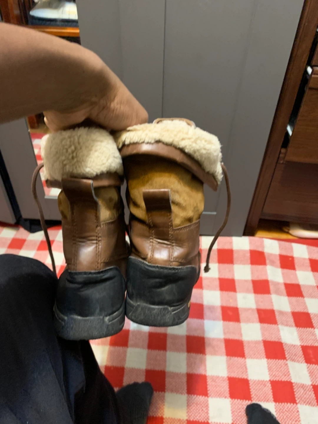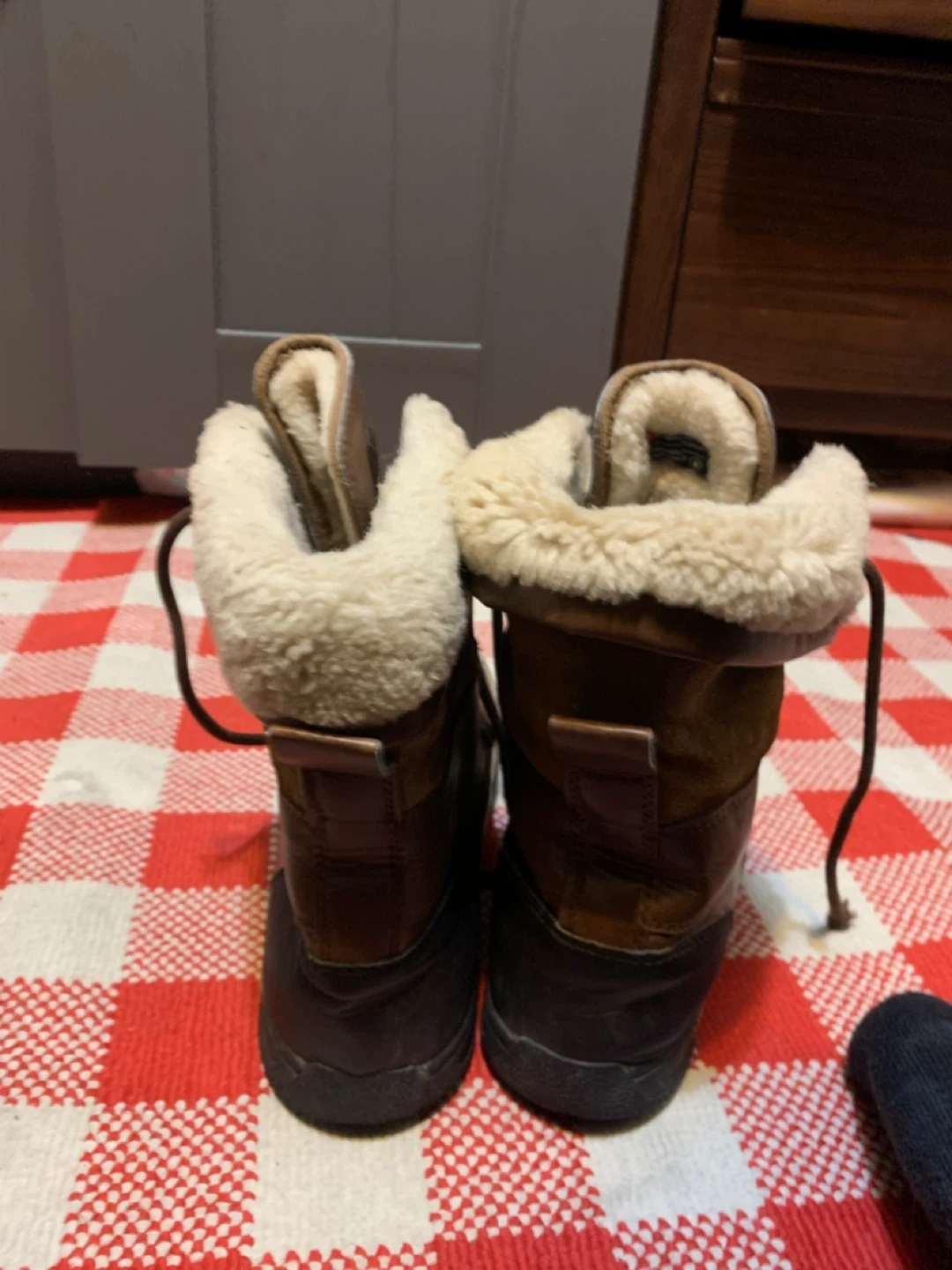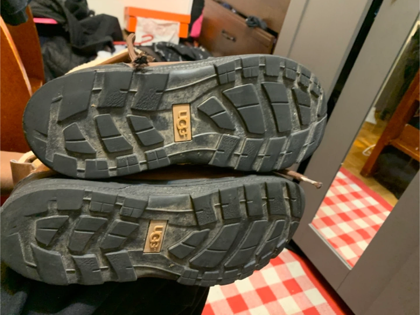 Selling a pair of UGG waterproof leather boots. They have a brown leather exterior with a black rubber sole. The inside is lined with a cozy, cream-coloured fur. They're in good condition and ready for the winter weather!