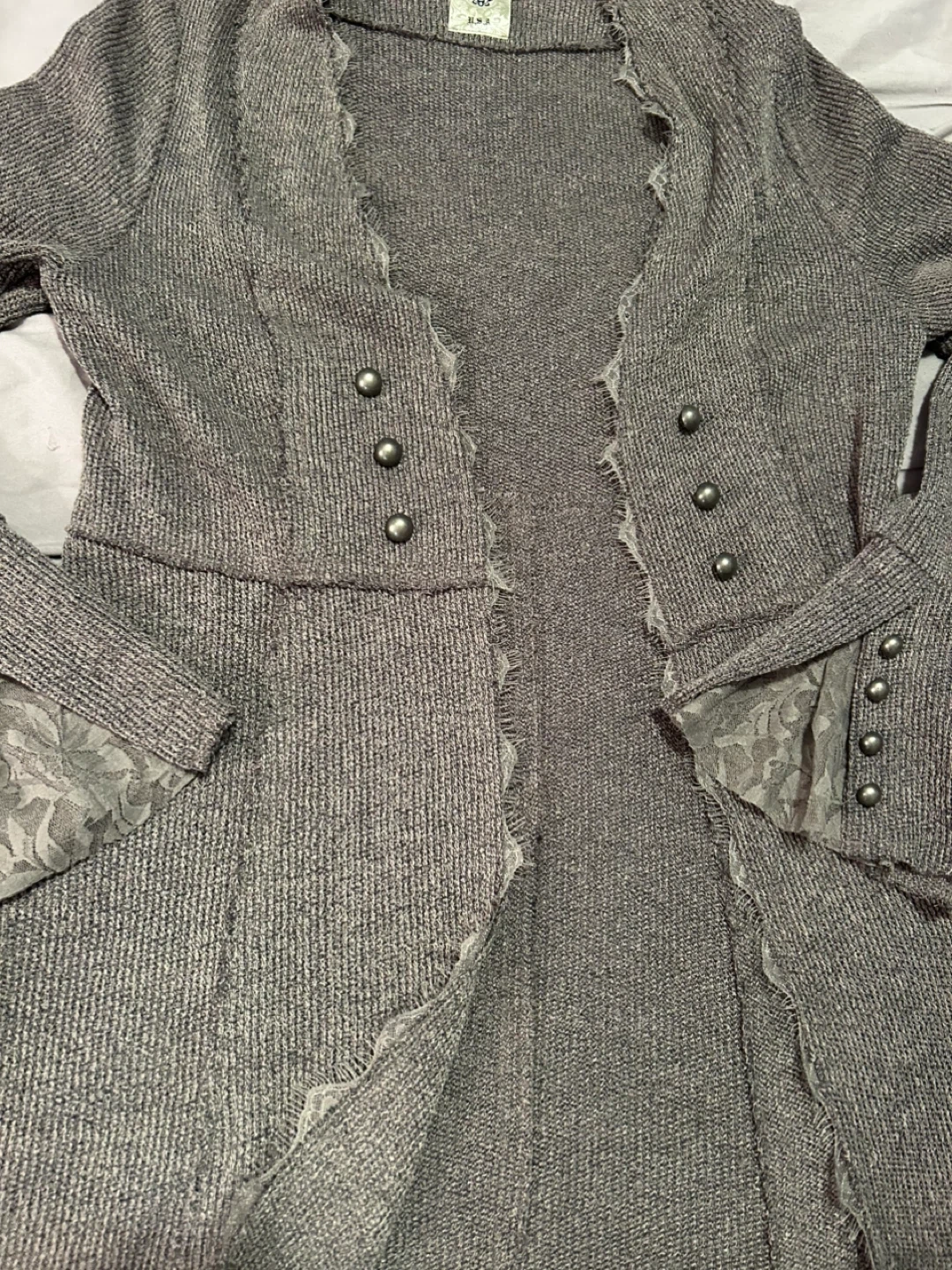 Selling a Vocal grey knit coat! It has a unique design with frayed edges and lace detailing on the sleeves. It's in good condition and perfect for layering during cooler weather