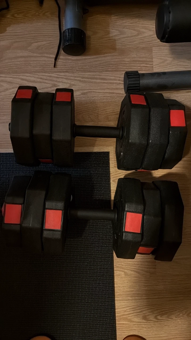 15 kg each - Selling a set of adjustable dumbbells, perfect for your home gym setup! These are in great condition and ready for a new owner. They are black with red accents.