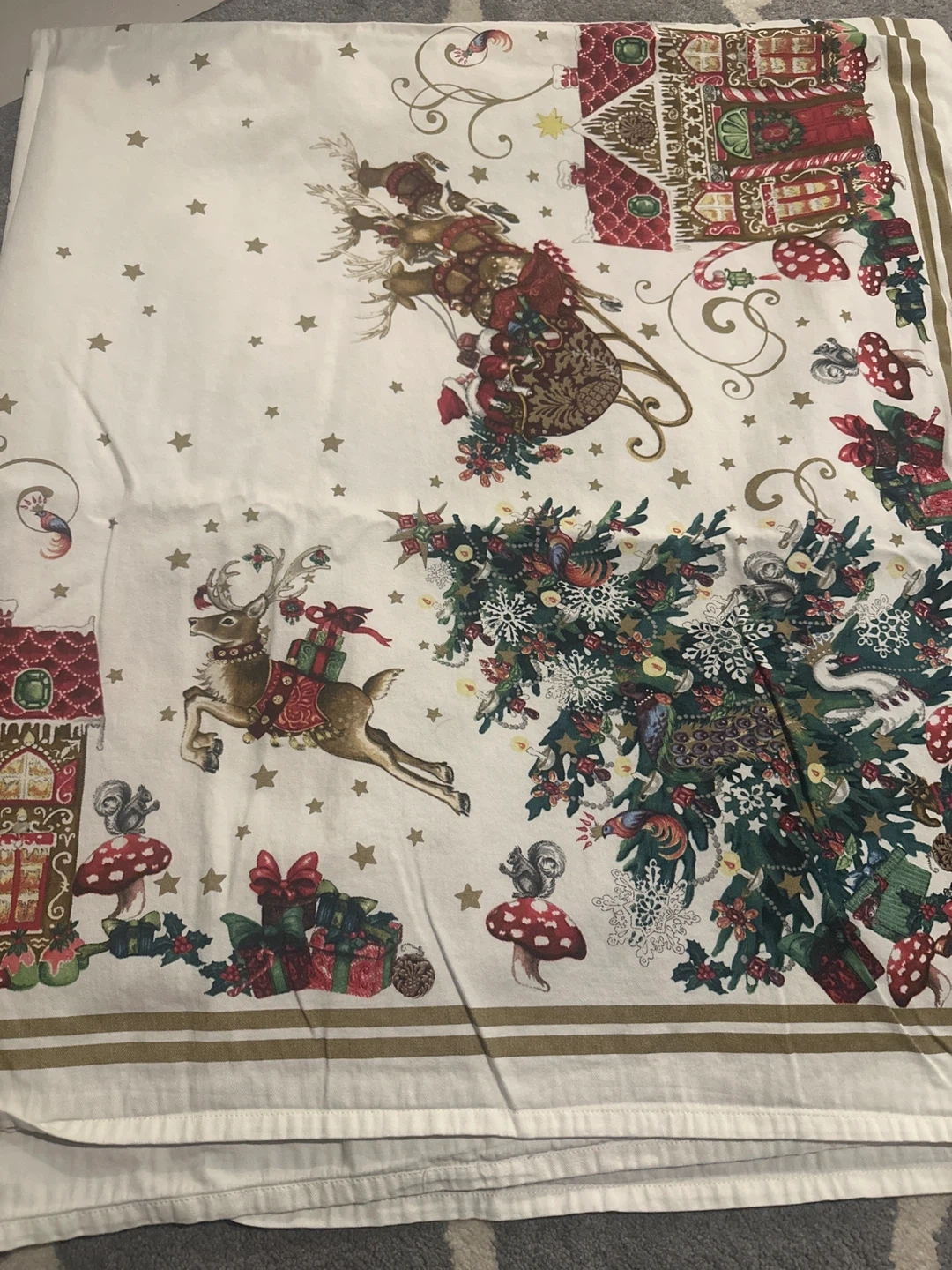 Here's a lovely Williams Sonoma Christmas tablecloth! It's perfect for adding a festive touch to your holiday gatherings. The design features reindeer, Christmas trees, and gingerbread houses, all in a charming and classic style. It's in great condition and ready to brighten up your home this season