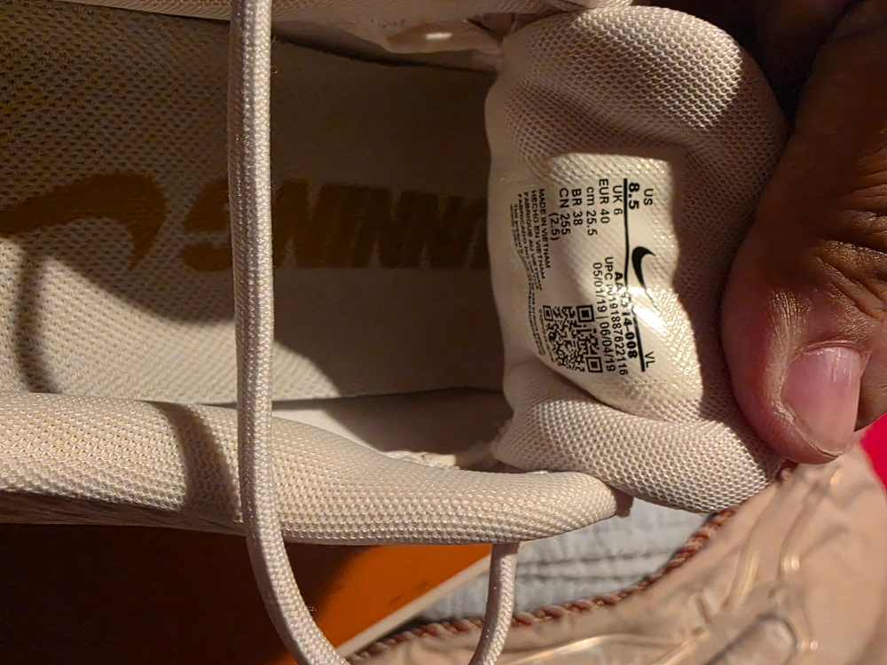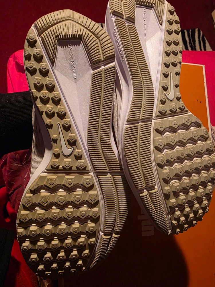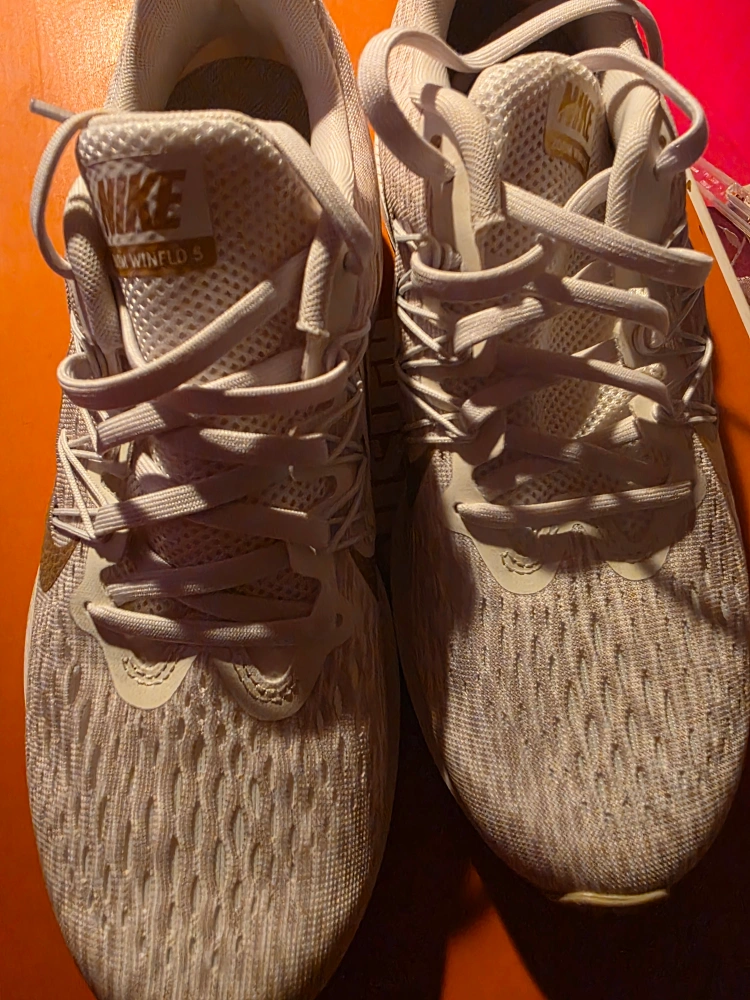 Selling a pair of Nike Zoom Winflo 5 running shoes for women! They are in good condition and ready for your next run or workout. The color is a light beige with gold accents.