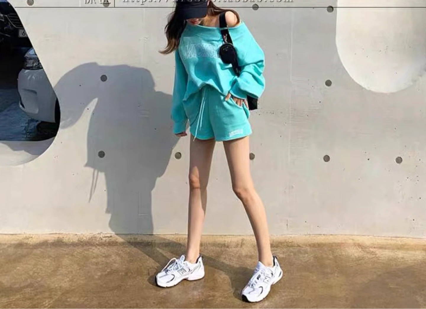 Korean Off Shoulder Sweatshirt & Shorts Set - Turquoise