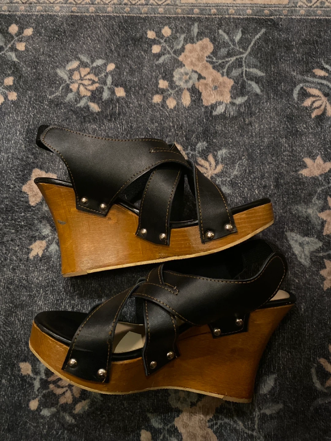 Selling a pair of Belle black wedge heels in size 37. They feature a stylish cross-strap design and a comfortable wedge heel.