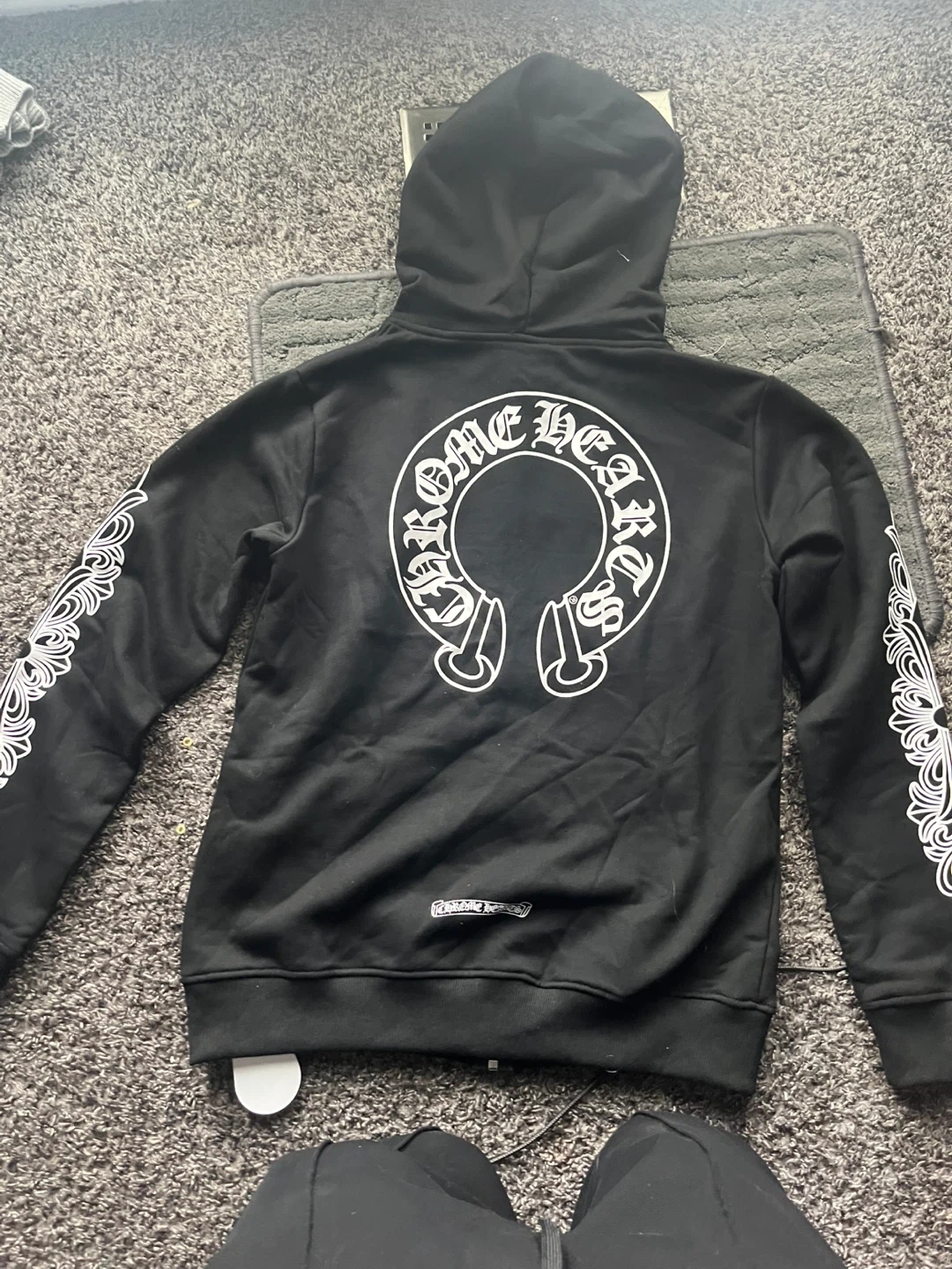 Selling a Chrome Hearts x Comme des Garçons hoodie. It's black with white graphics on the back and sleeves. The zipper pull is also a Chrome Hearts design. Great for adding a bit of edge to your style!