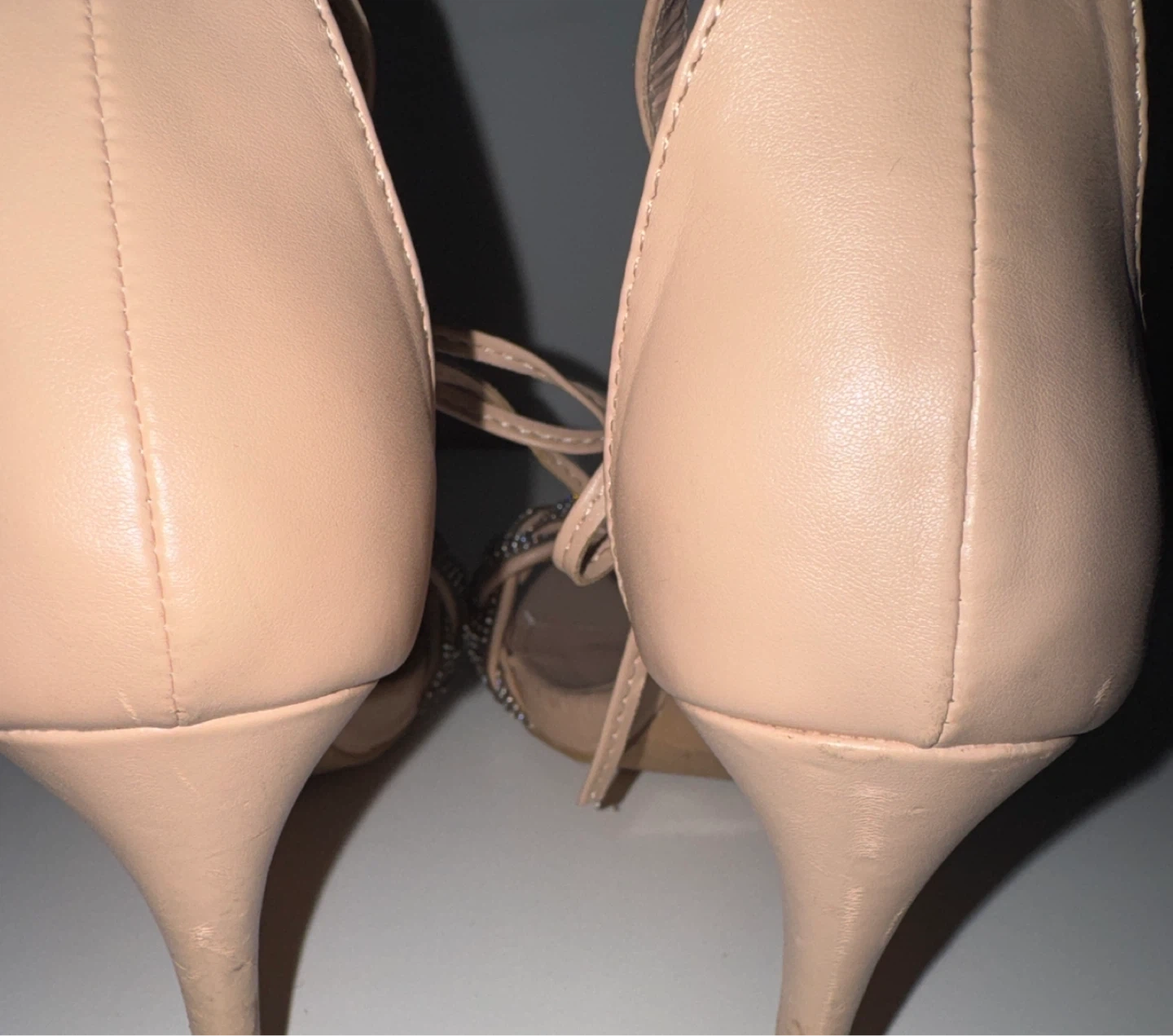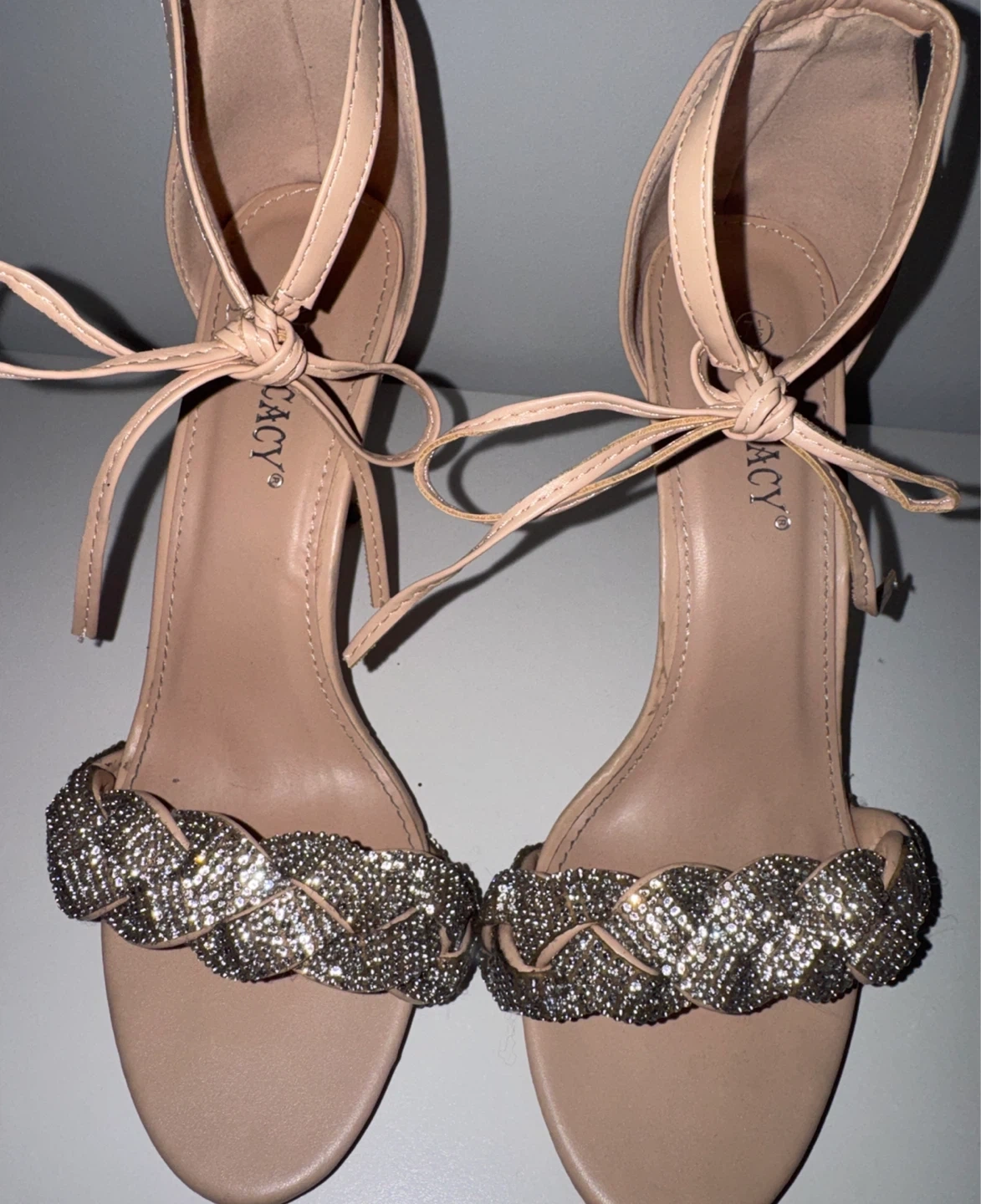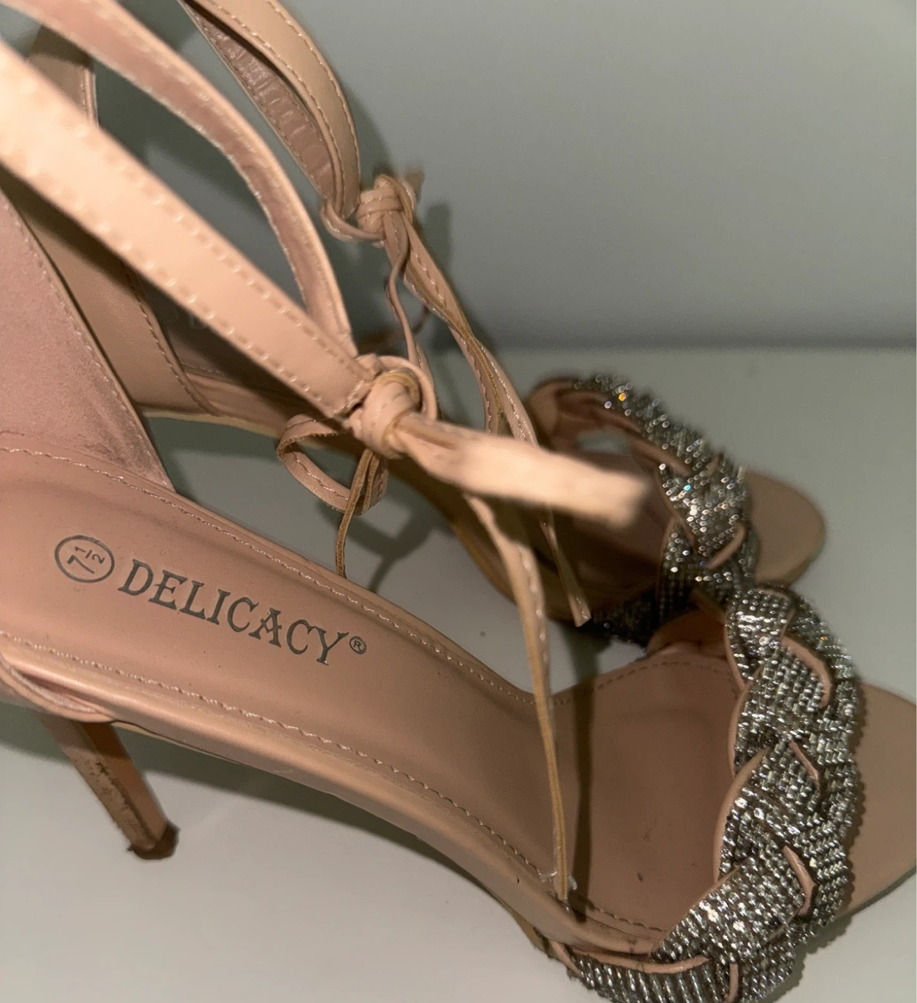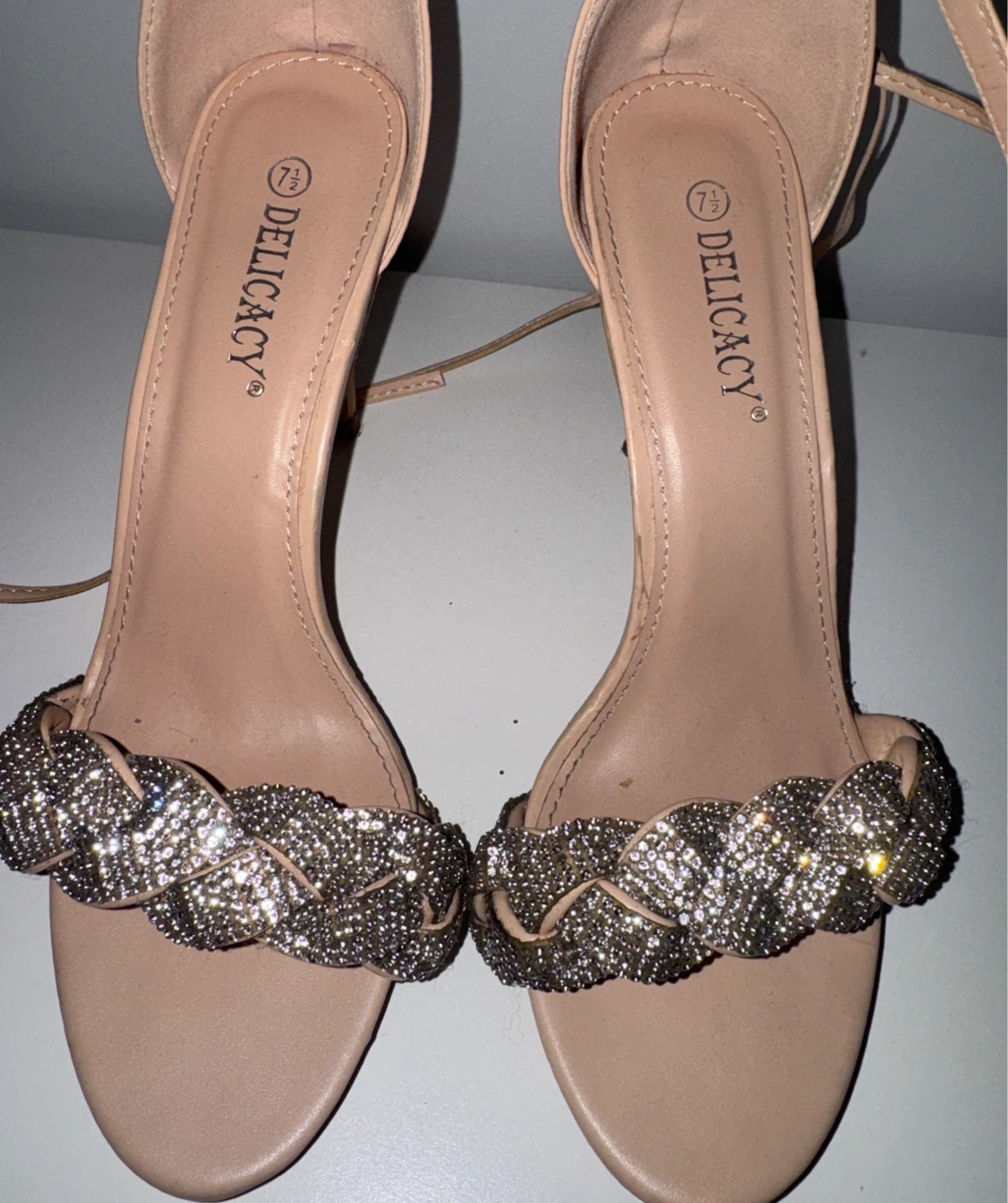 Selling a pair of Delicacy heels in a size 7.5. They have a lovely braided design with rhinestones across the toes and a tie-up ankle strap. Perfect for parties