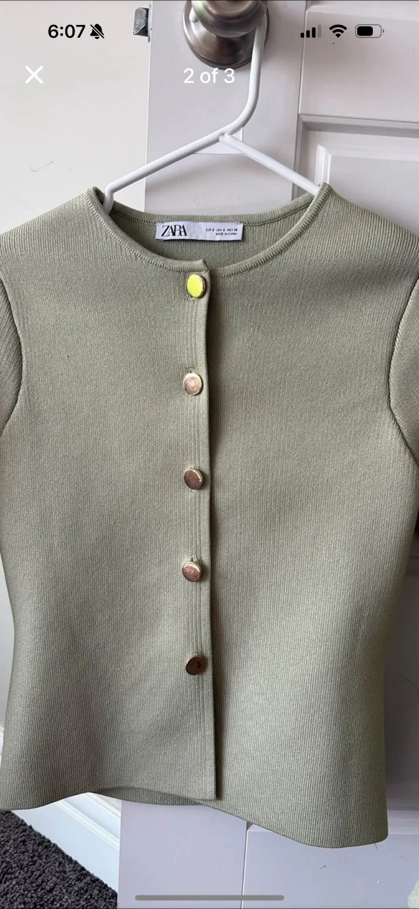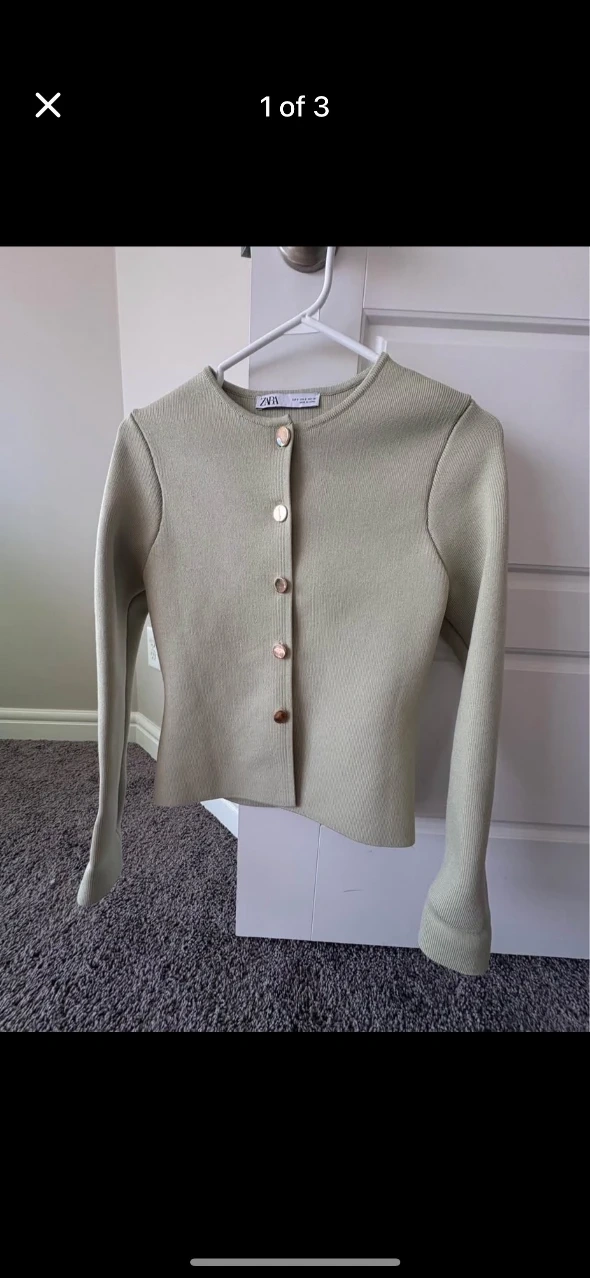 Selling a Zara knit cardigan in a lovely sage green colour! It's a size small and features gold buttons. Perfect for layering or wearing on its own!
