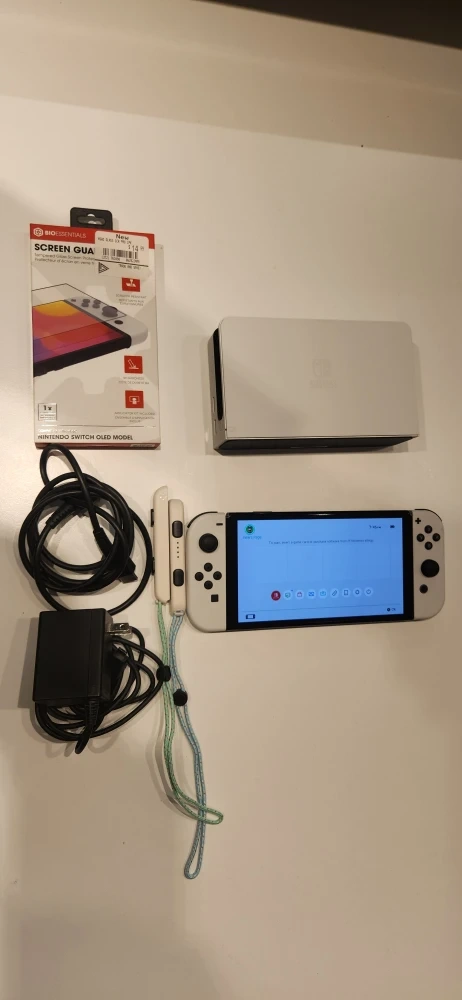 Selling a Nintendo Switch OLED model in white. It comes with a new screen protector, hdmi cable, charger and dock
