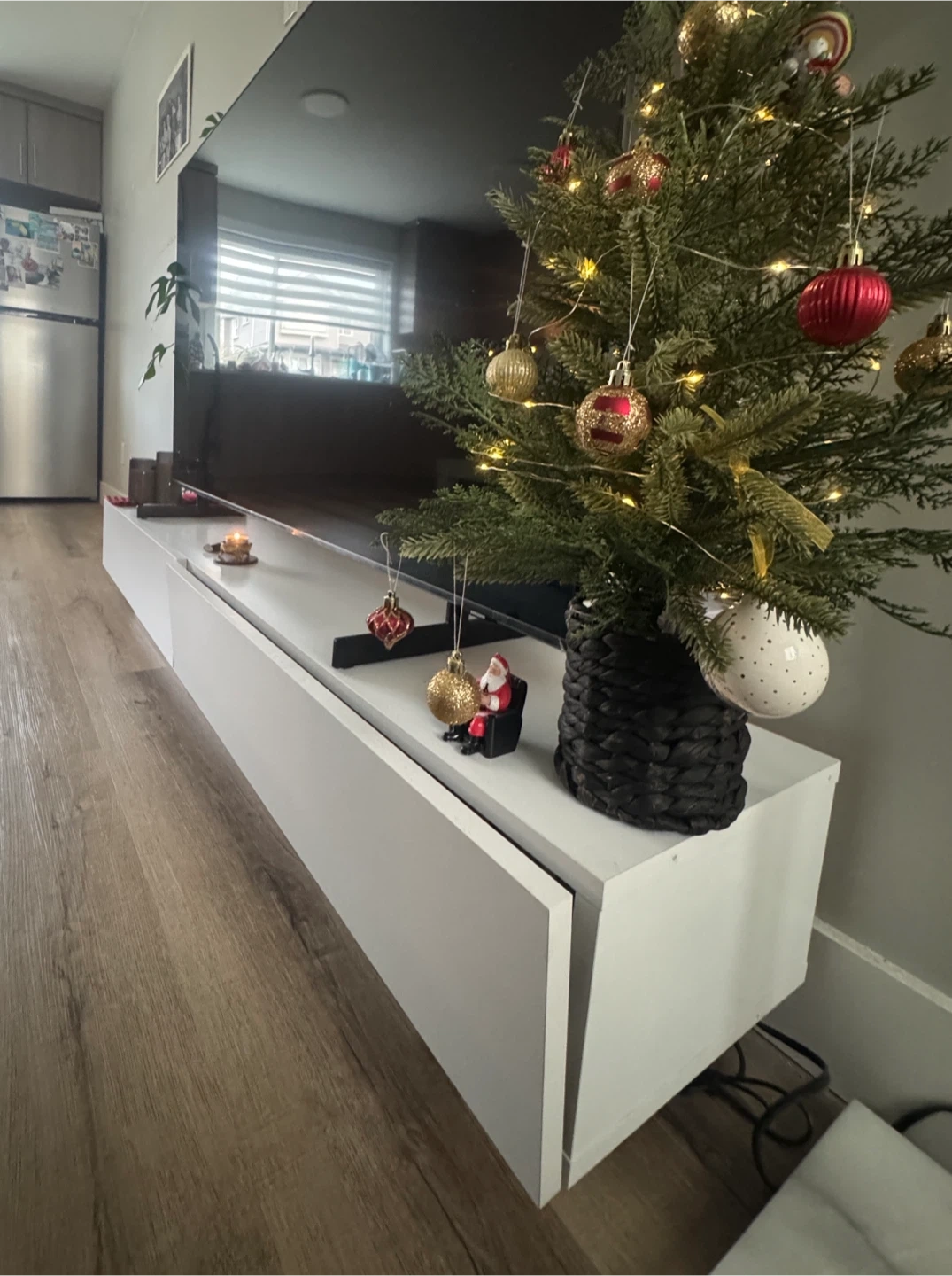 Selling a modern white TV stand that can accommodate TVs up to 75 inches. The stand is in very good shape and ready for a new home. The right door hangs open a little as it need one new hinge installed. The dimensions are shown in the picture!