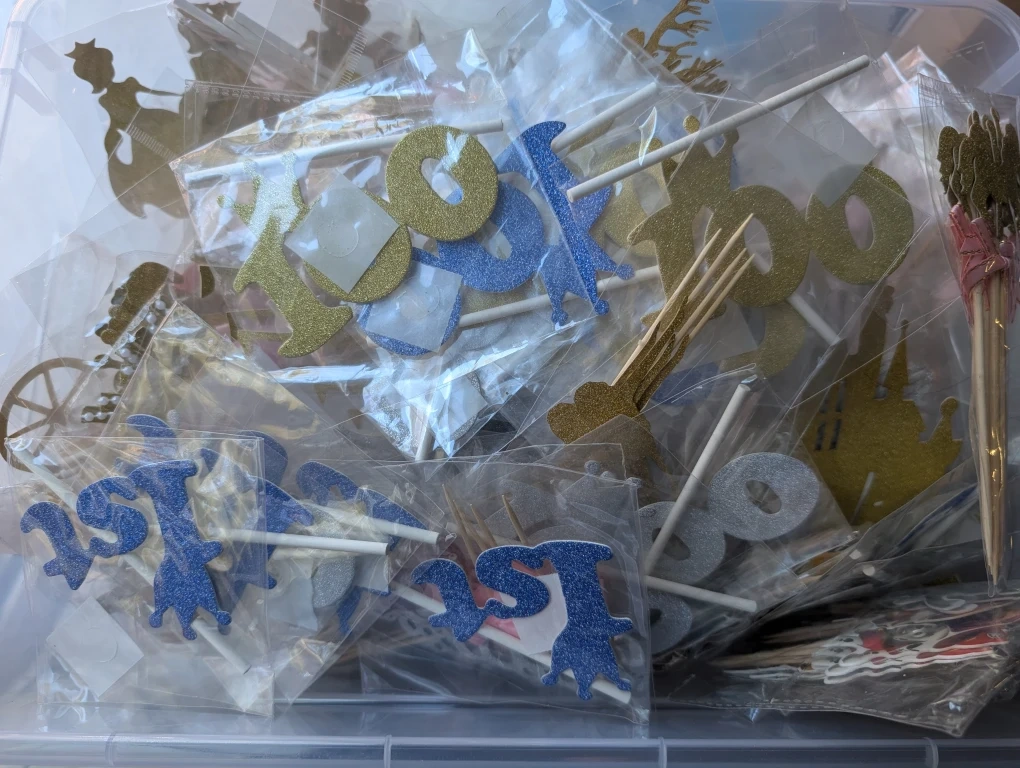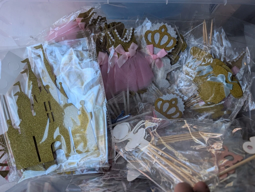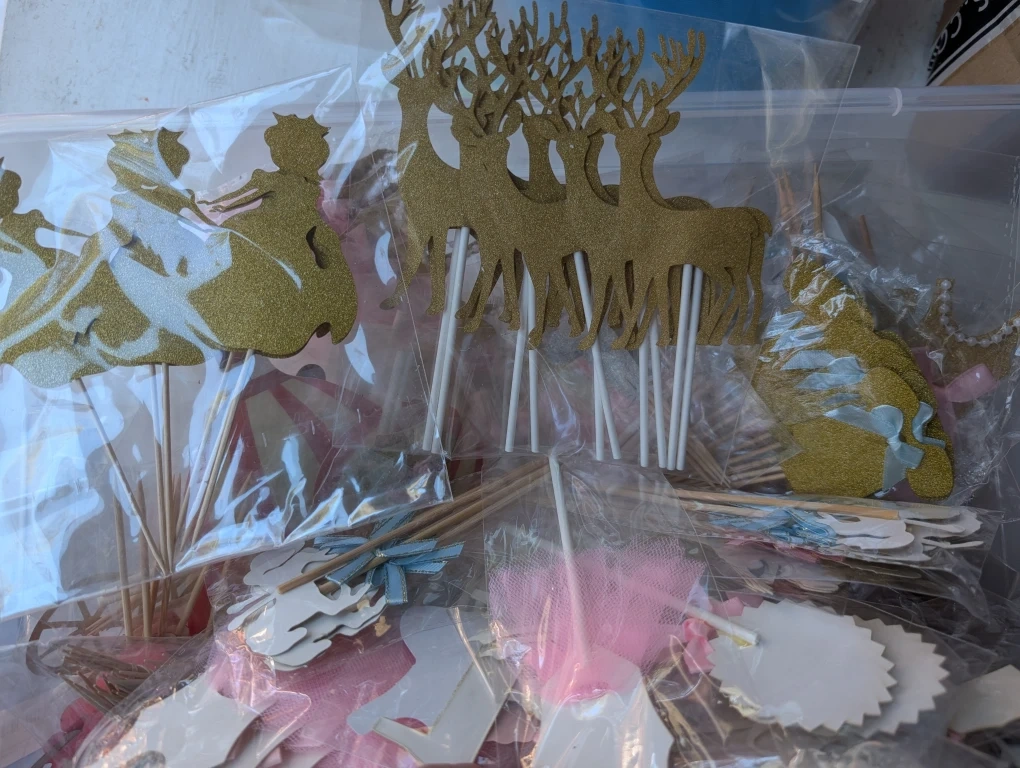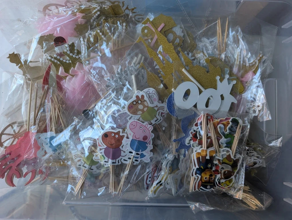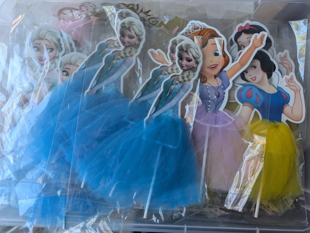 I have a bunch of cake toppers for sale. They come in assorted designs including Peter Rabbit, Disney princesses, reindeer, castles, crowns, Peppa Pig, and Paw Patrol. Perfect for birthday parties or special occasions! Total value over $100.