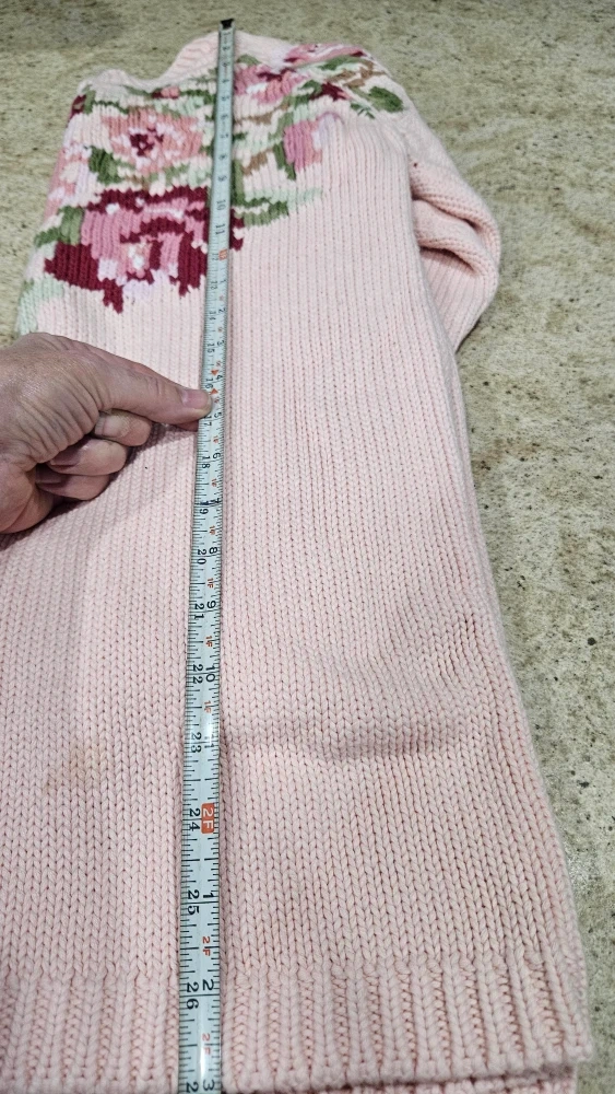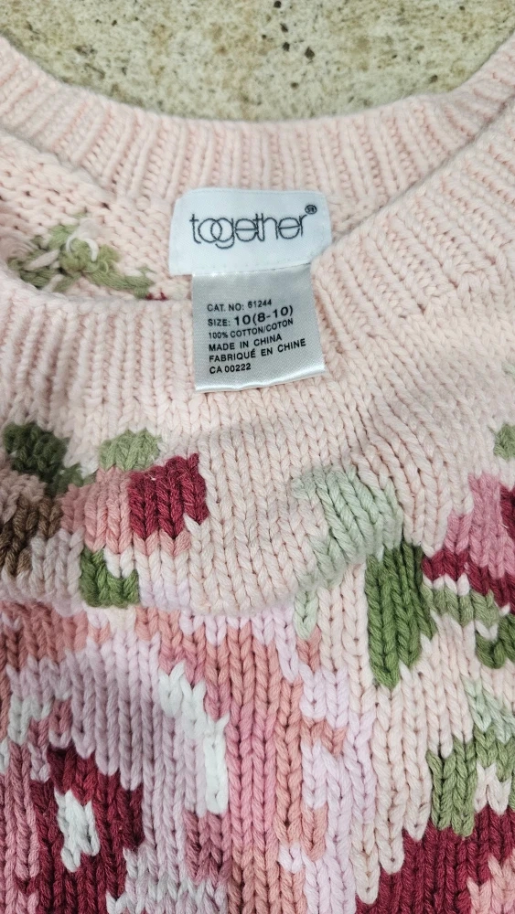 Check out this adorable Together knit sweater! It's a soft peach pink colour with a beautiful floral design. The size is 10 and it's made of 100% cotton. Perfect for keeping cozy! It is super soft . Barely worn, if at all. Looks hand knit