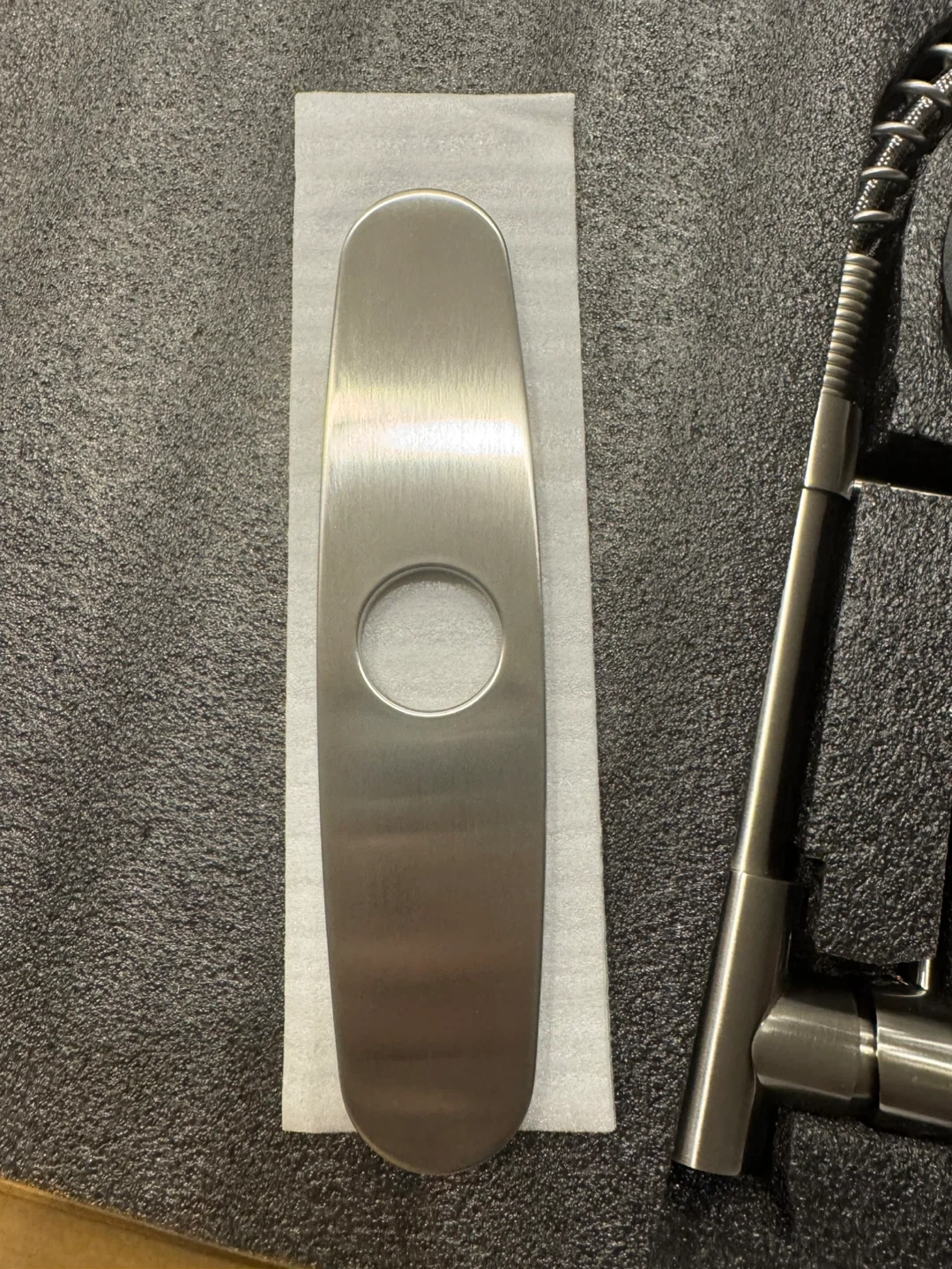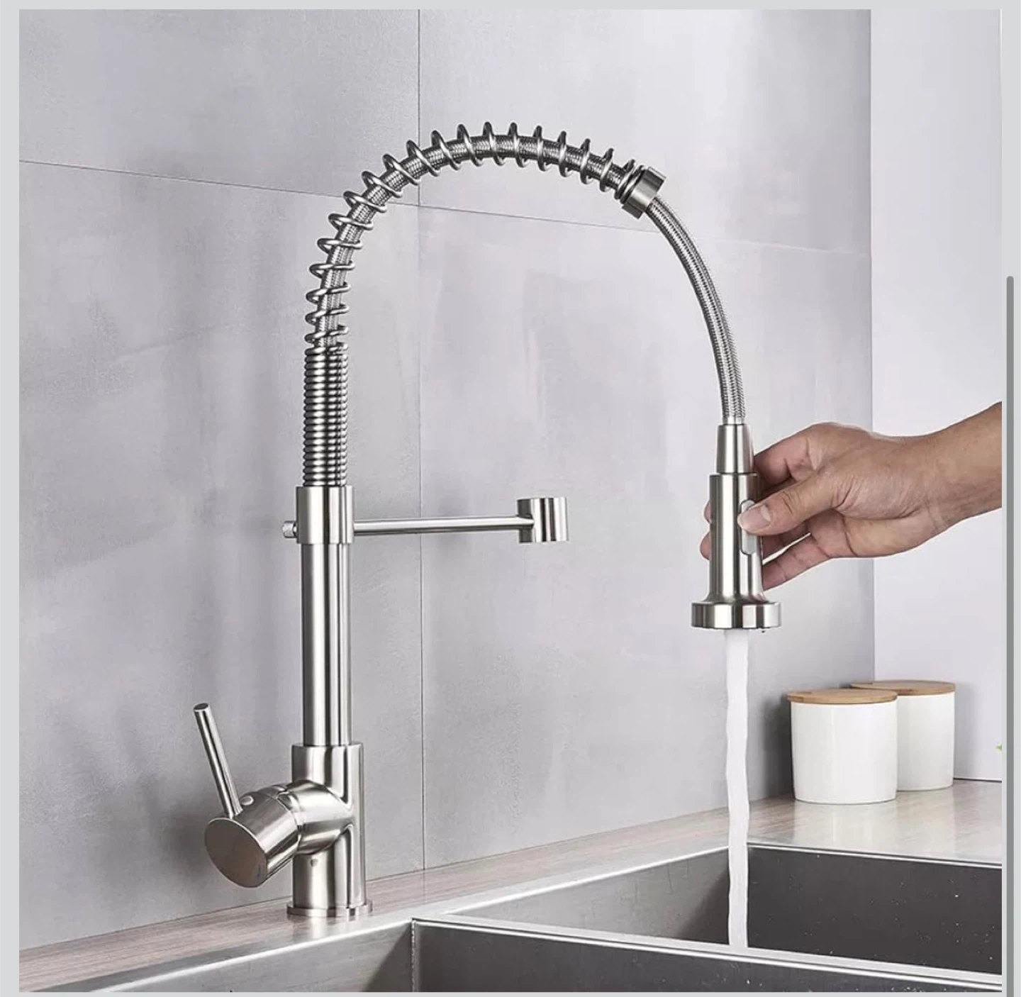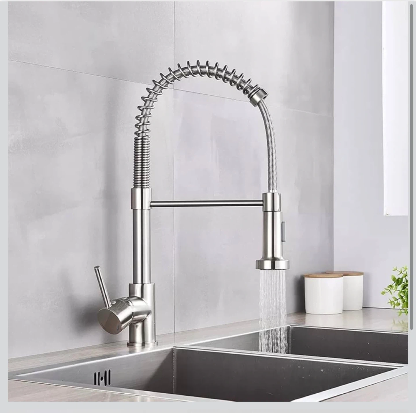 Selling a brand new kitchen faucet with a pull-down sprayer! It's still in its original box and has never been used. The faucet is a sleek, modern design that would look great in any kitchen. It features a flexible, coiled spring neck and a single handle for easy temperature and water flow control. All the necessary components for installation are included in the box.