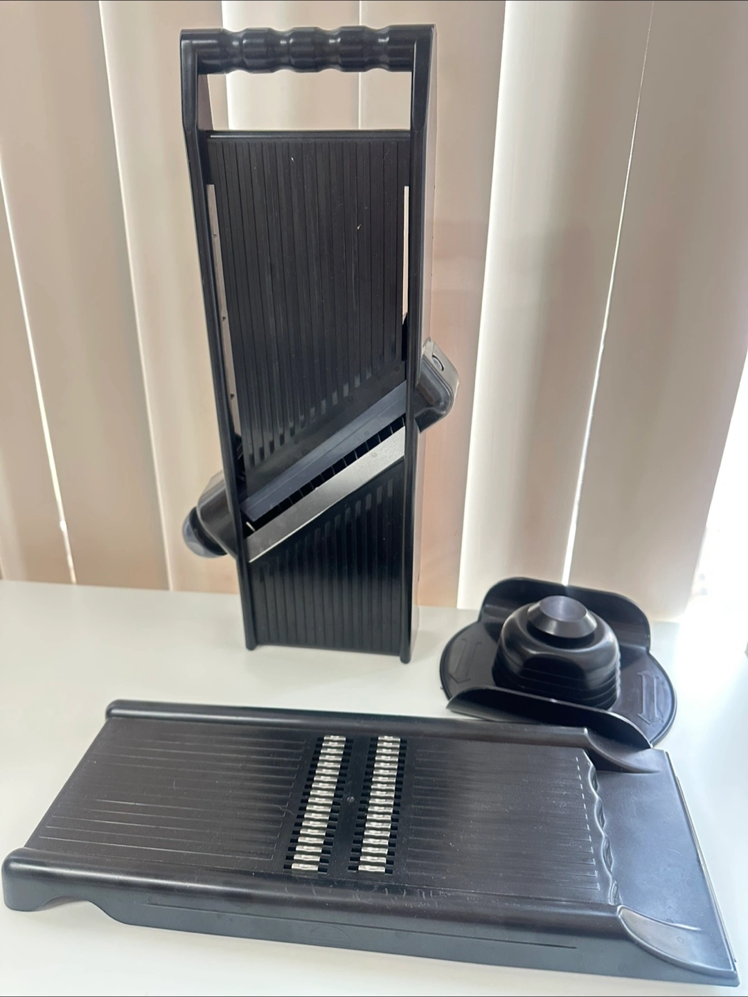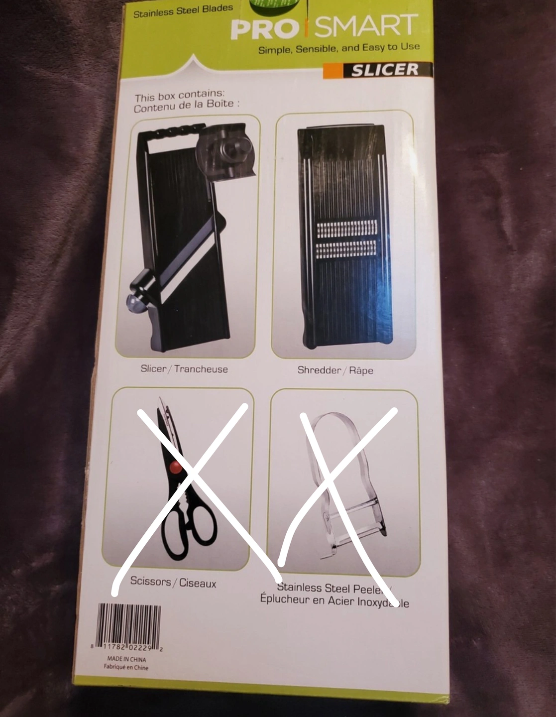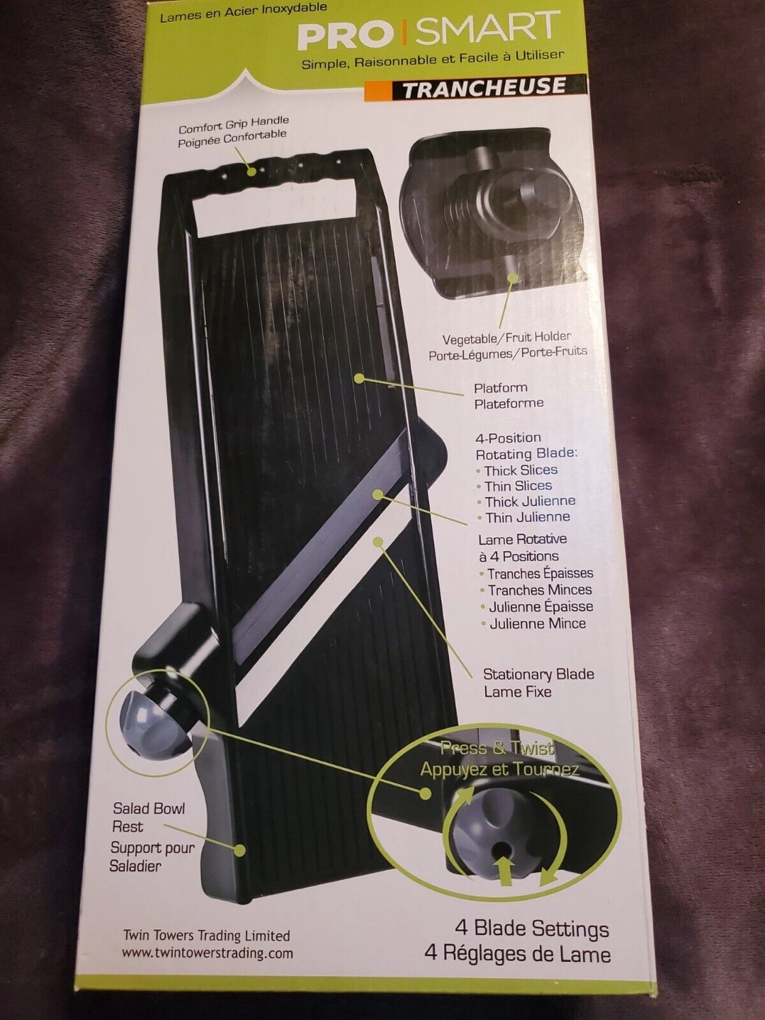I'm selling a PRO|SMART slicer, shredder, and chopper. It features stainless steel blades and is designed to be simple, sensible, and easy to use. It comes with a comfort grip handle and a vegetable/fruit holder. The box indicates it has 4 blade settings. Originally bought for $123.81