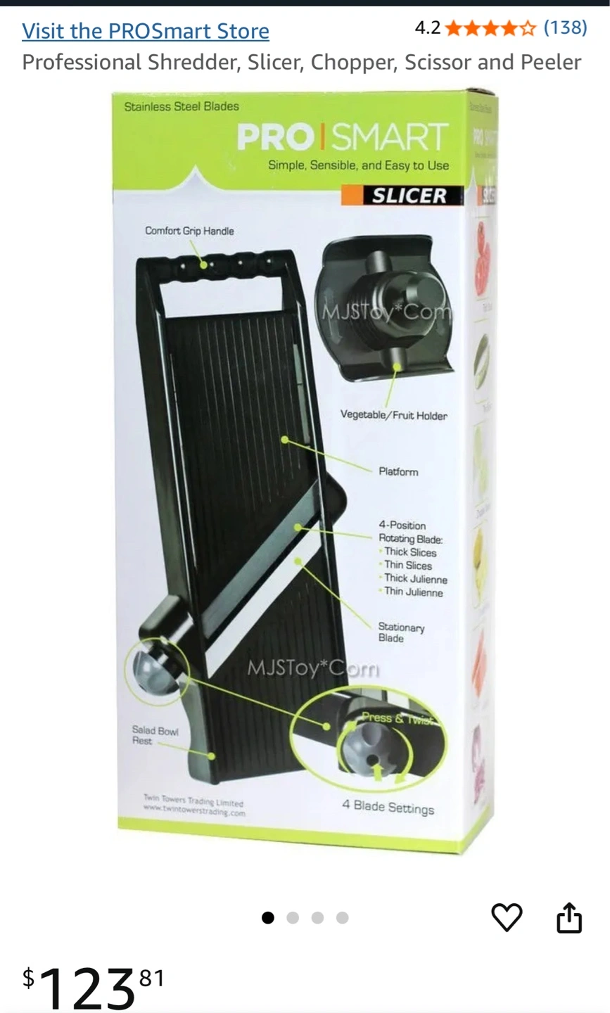 I'm selling a PRO|SMART slicer, shredder, and chopper. It features stainless steel blades and is designed to be simple, sensible, and easy to use. It comes with a comfort grip handle and a vegetable/fruit holder. The box indicates it has 4 blade settings. Originally bought for $123.81