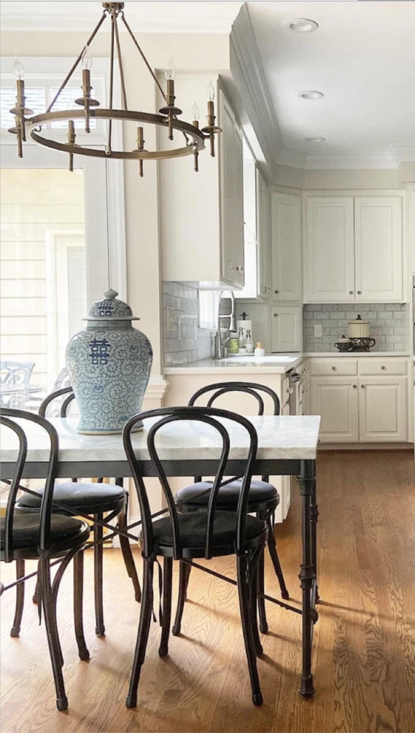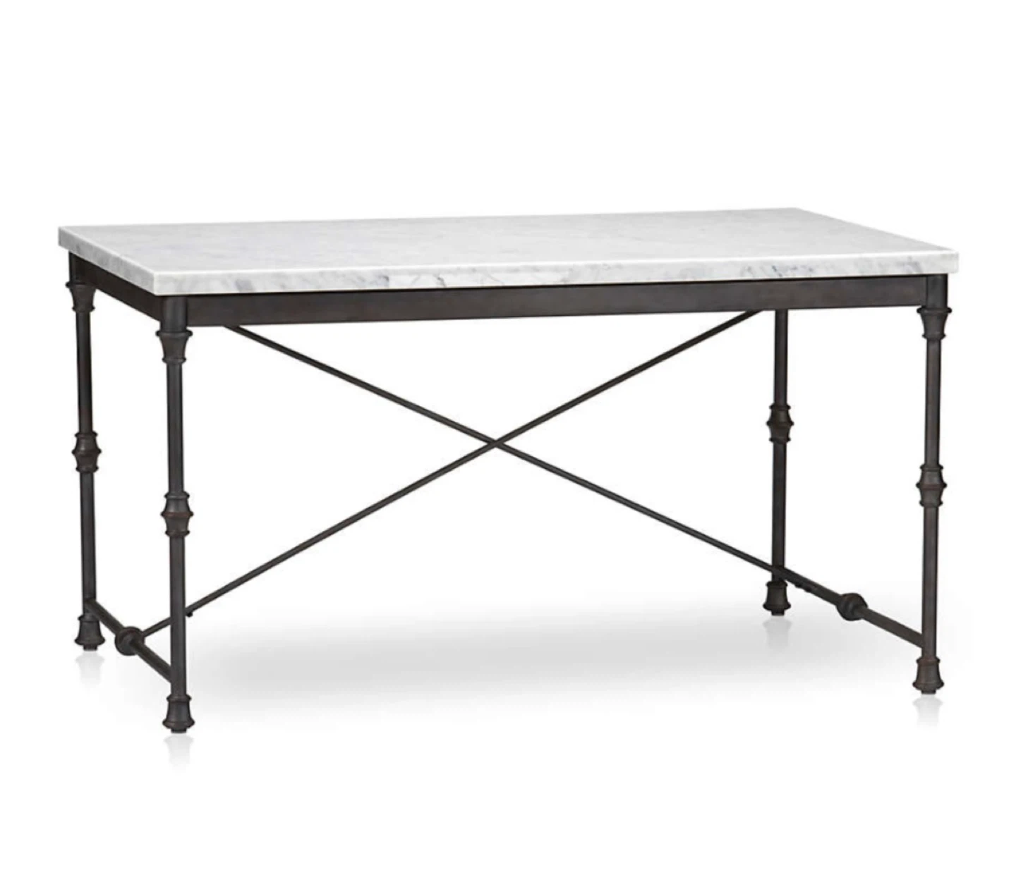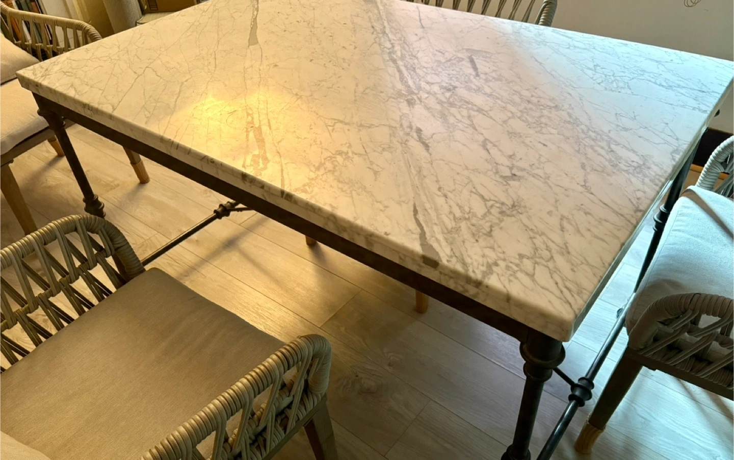 This is a lovely table with a marble top and an iron base. It would be a great addition to any dining room or kitchen! The marble started to separate from the table so I epoxy-ed it together.