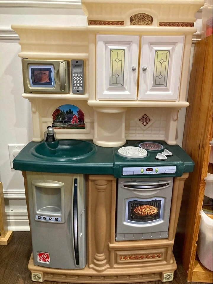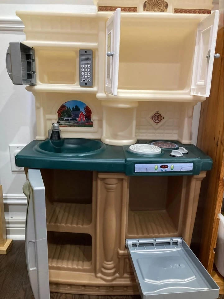 This Step2-style kids play kitchen is perfect for hours of pretend play! Sturdy, durable plastic construction with tons of built-in features kiddos love. Great for toddlers and young kids who enjoy cooking, role-play, and imaginative play. All doors open and close smoothly (microwave, fridge, oven, upper cabinets). Sink, stove burners, and phone add extra fun!