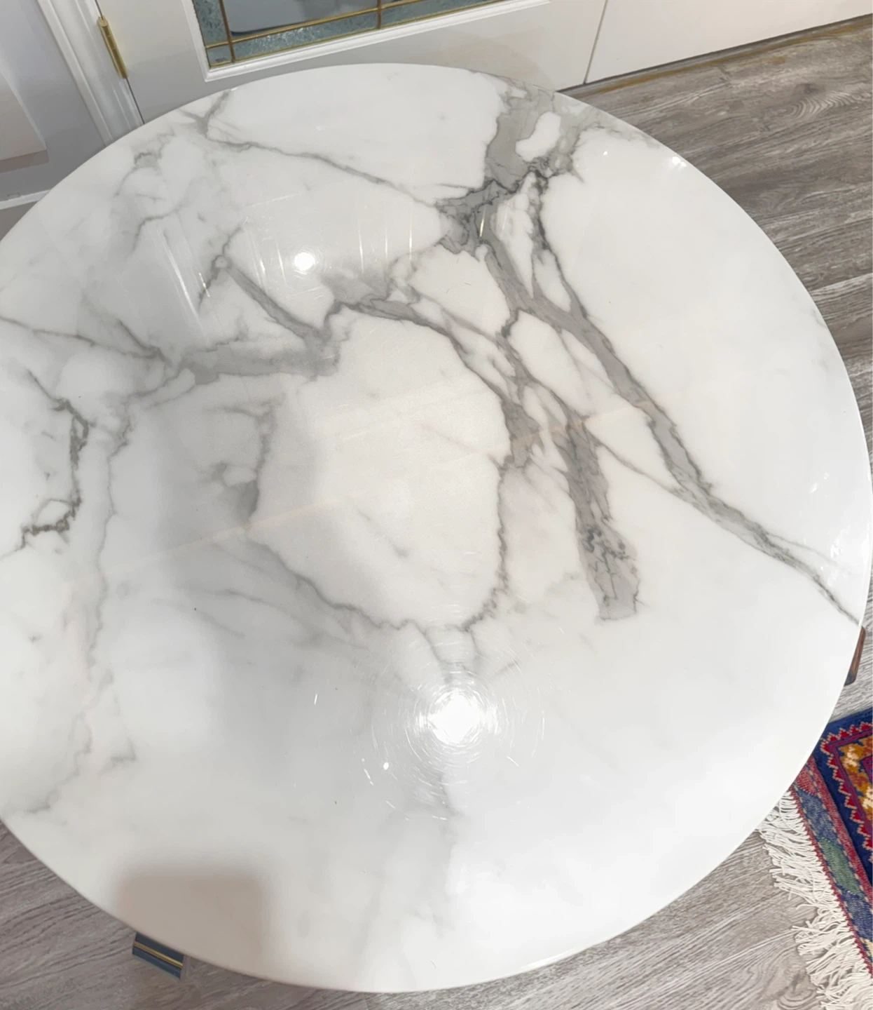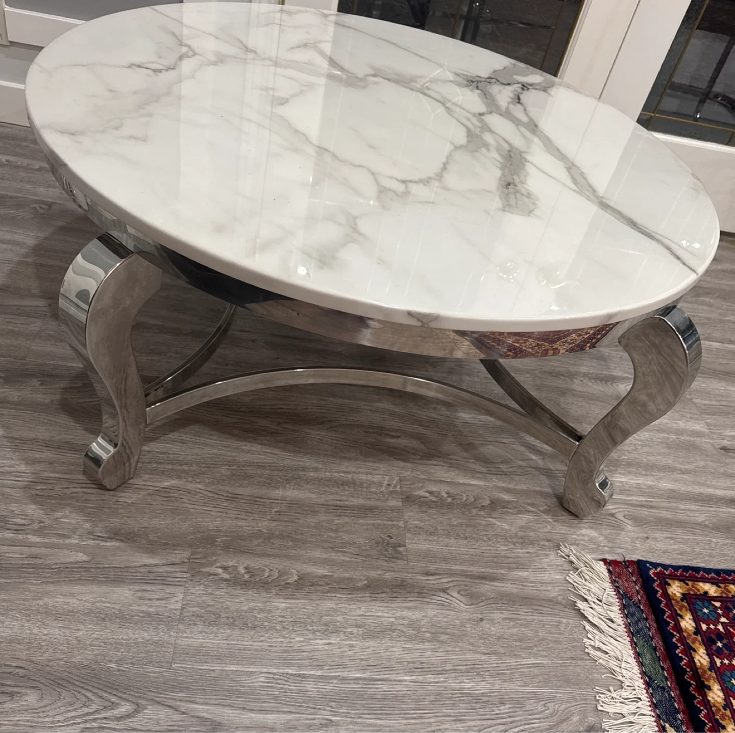 Selling a stylish oval coffee table with a beautiful marble top! The base has a shiny, chrome-like finish. It's in good condition and would look great in any living room