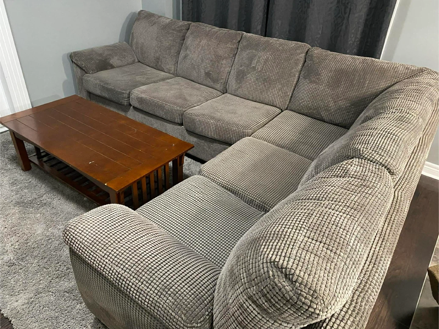 Selling a large and comfy sectional sofa! It's perfect for lounging and fits well in a spacious living room. The fabric is a textured weave in a neutral colour that would blend with most decor styles. It's in great condition and ready for a new home!