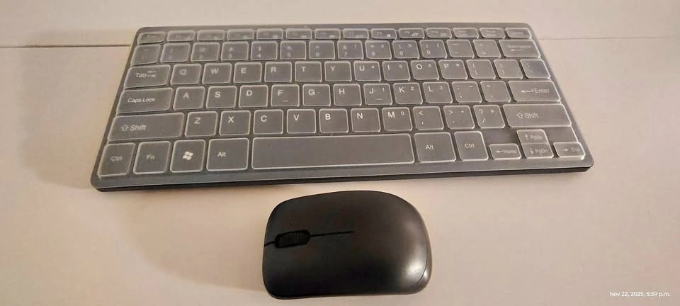 Lightweight wireless keyboard with matching wireless mouse. Both work perfectly and are super easy to set up — just plug in the USB receiver and you’re good to go. Ideal for a laptop, desktop, smart TV, or a minimal desk setup.