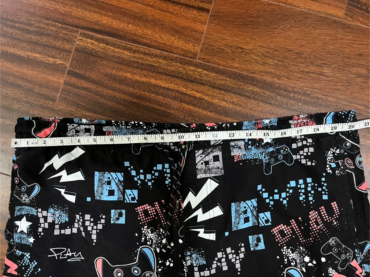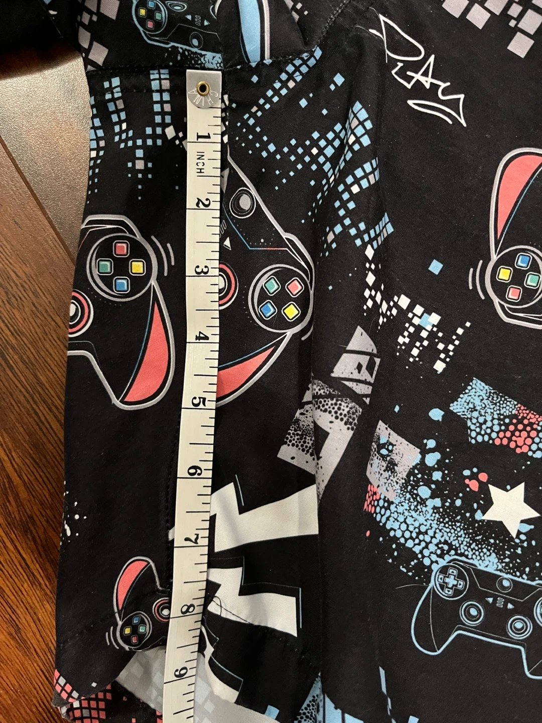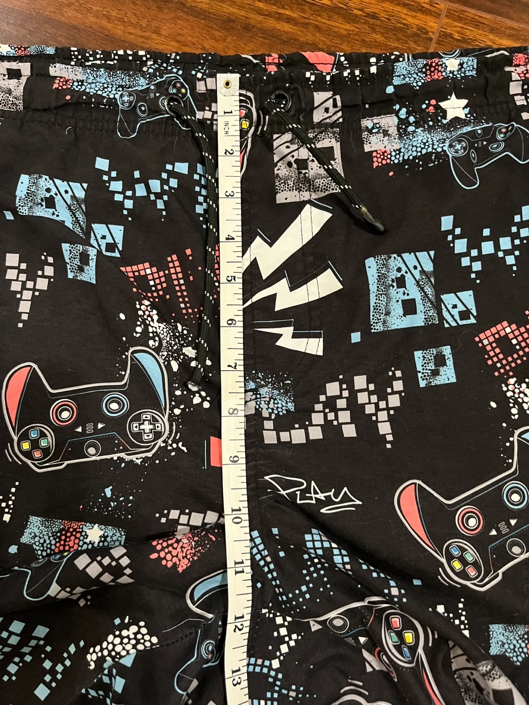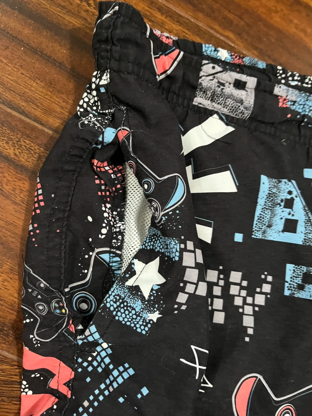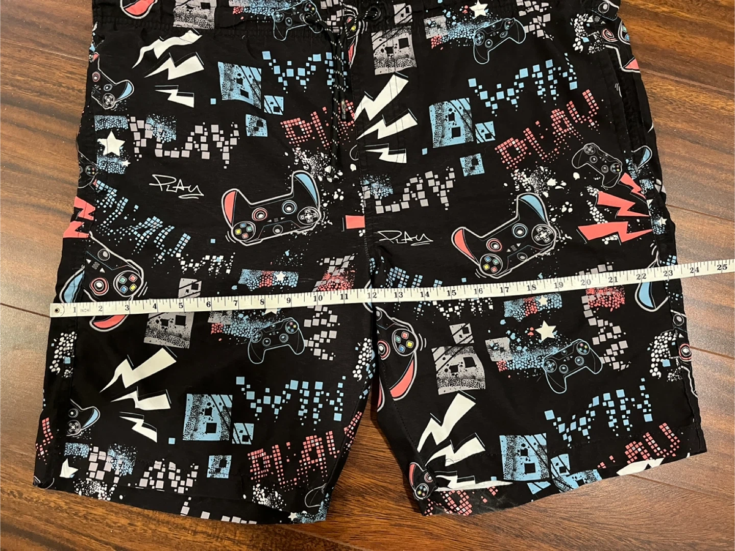 Texfit men’s medium swimming trunks featuring a gaming graphic design. Good condition with some fading. Includes mesh inner brief, drawstring waist, two side pockets and one right back patch pocket. Made of 100% polyester. Smoke free home.