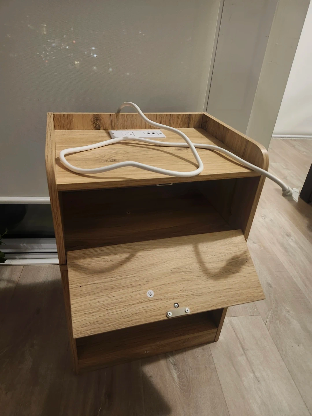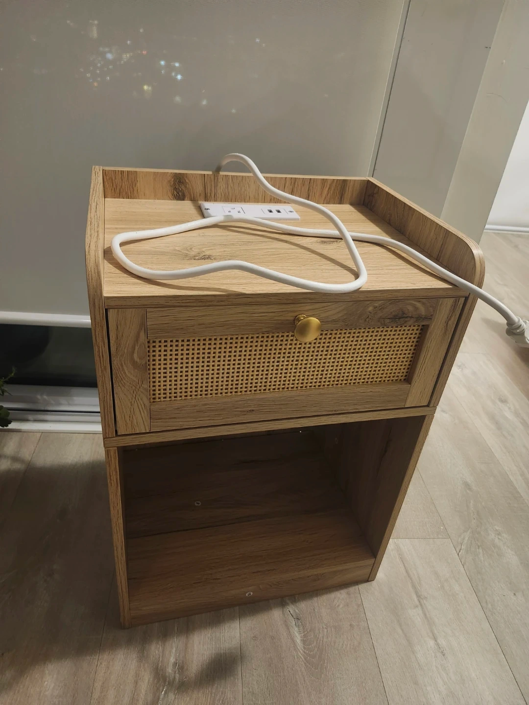 Selling a wood nightstand in great condition! It features built-in charging ports on top, so it's super convenient for charging your phone or other devices overnight. It also has a drawer and open storage space below.