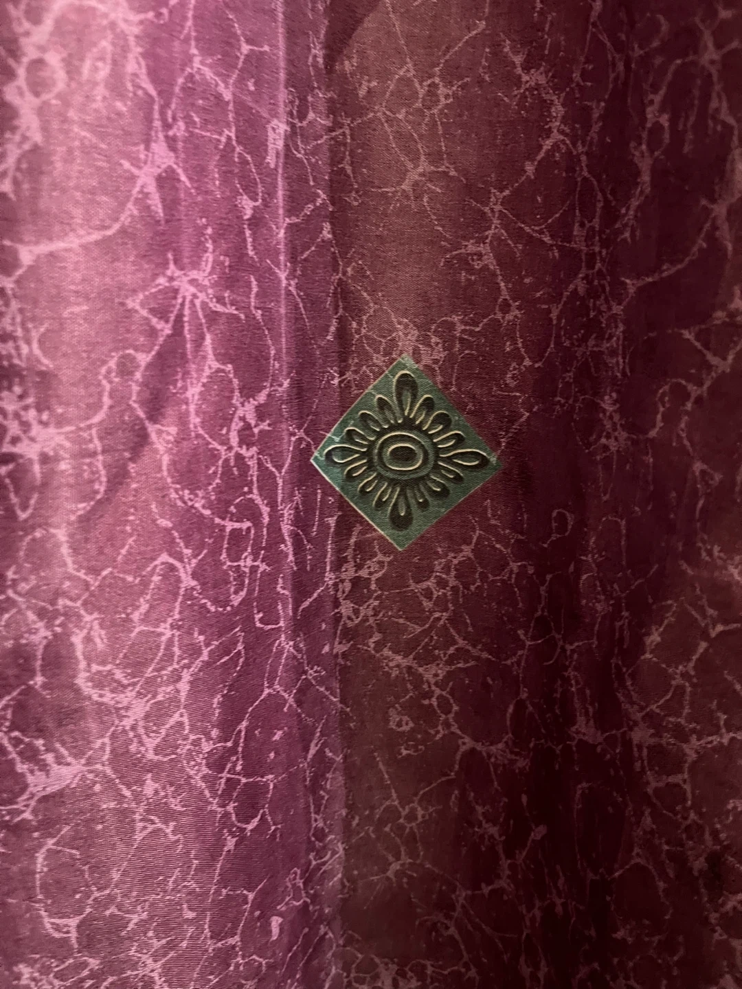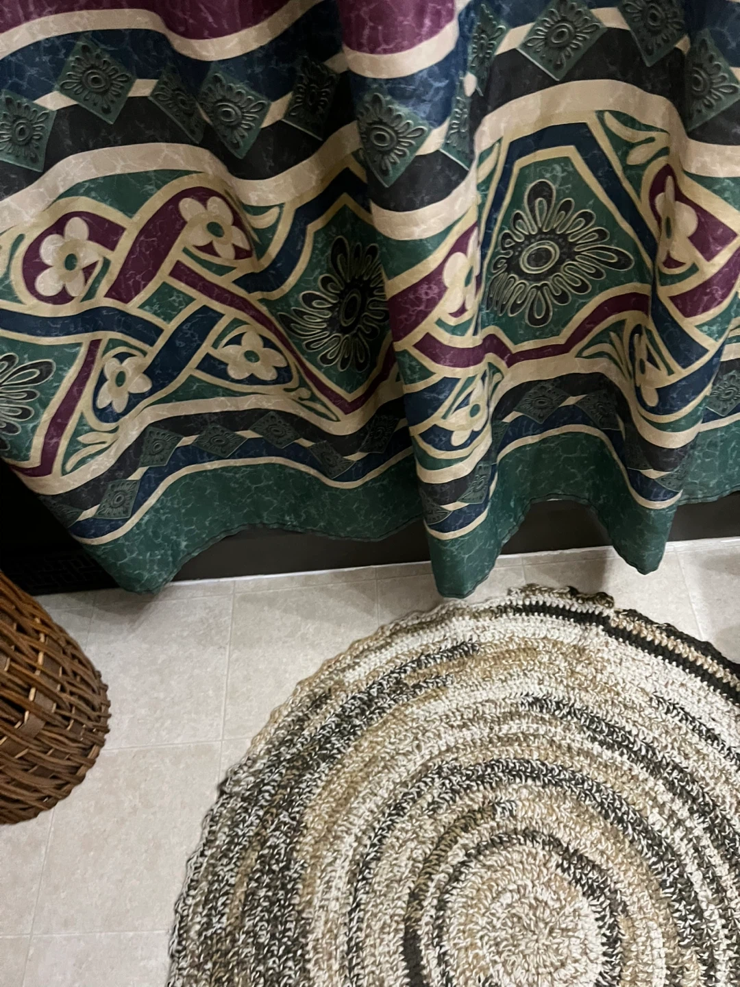 Selling a used shower curtain with a purple and green patterned design. It shows some wear still in good condition and ready to add a touch of style to your bathroom
