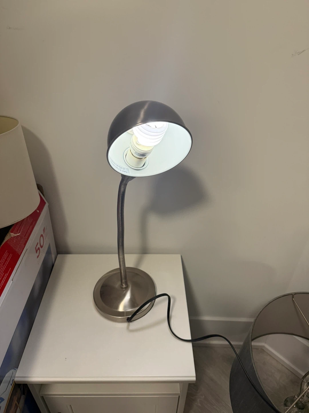 Selling a silver gooseneck desk lamp! It's in great condition and perfect for a desk or bedside table. The flexible gooseneck allows you to adjust the light exactly where you need it. It adds a touch of style to any room!