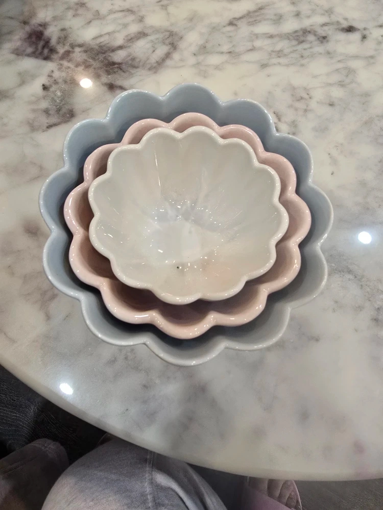 Here's a set of three adorable flower-shaped bowls! They come in a lovely pastel colour palette, including light blue, pink, and white. Perfect for adding a touch of whimsy to your table setting or for serving snacks
