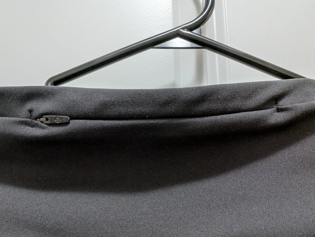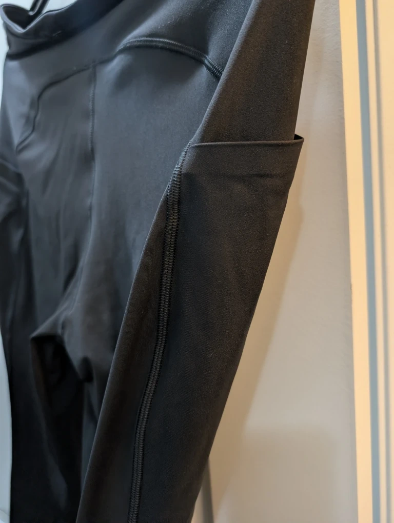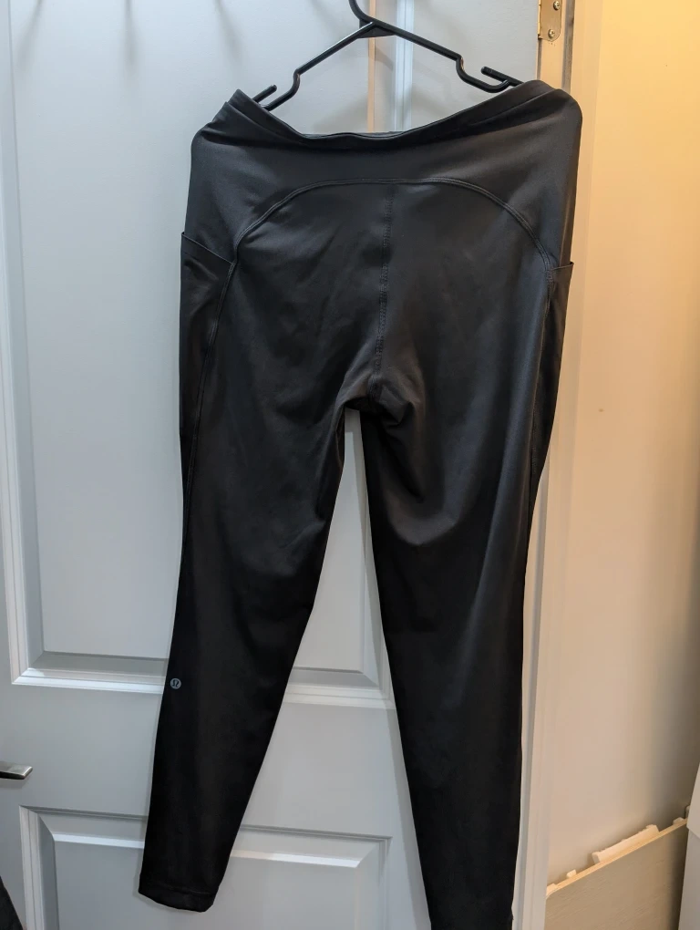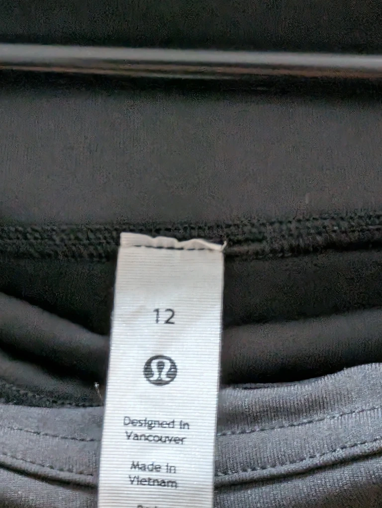 Lululemon leggings in black. They're a size 12. Perfect for workouts or just lounging around. Pockets on the side and a zip on the back.