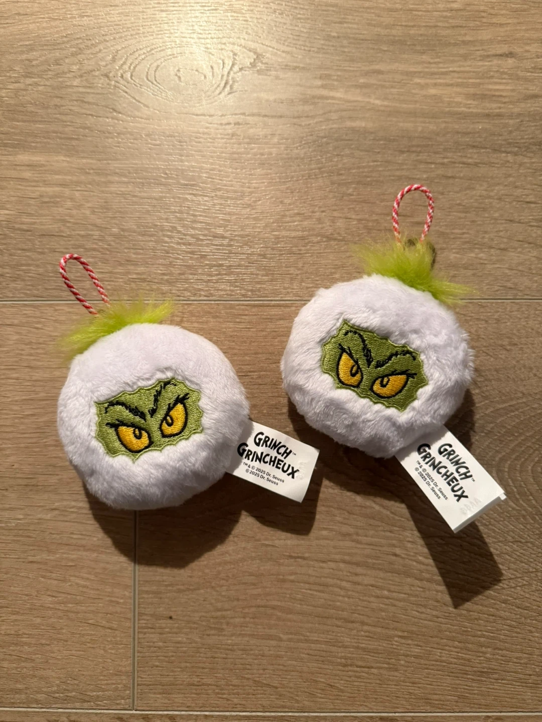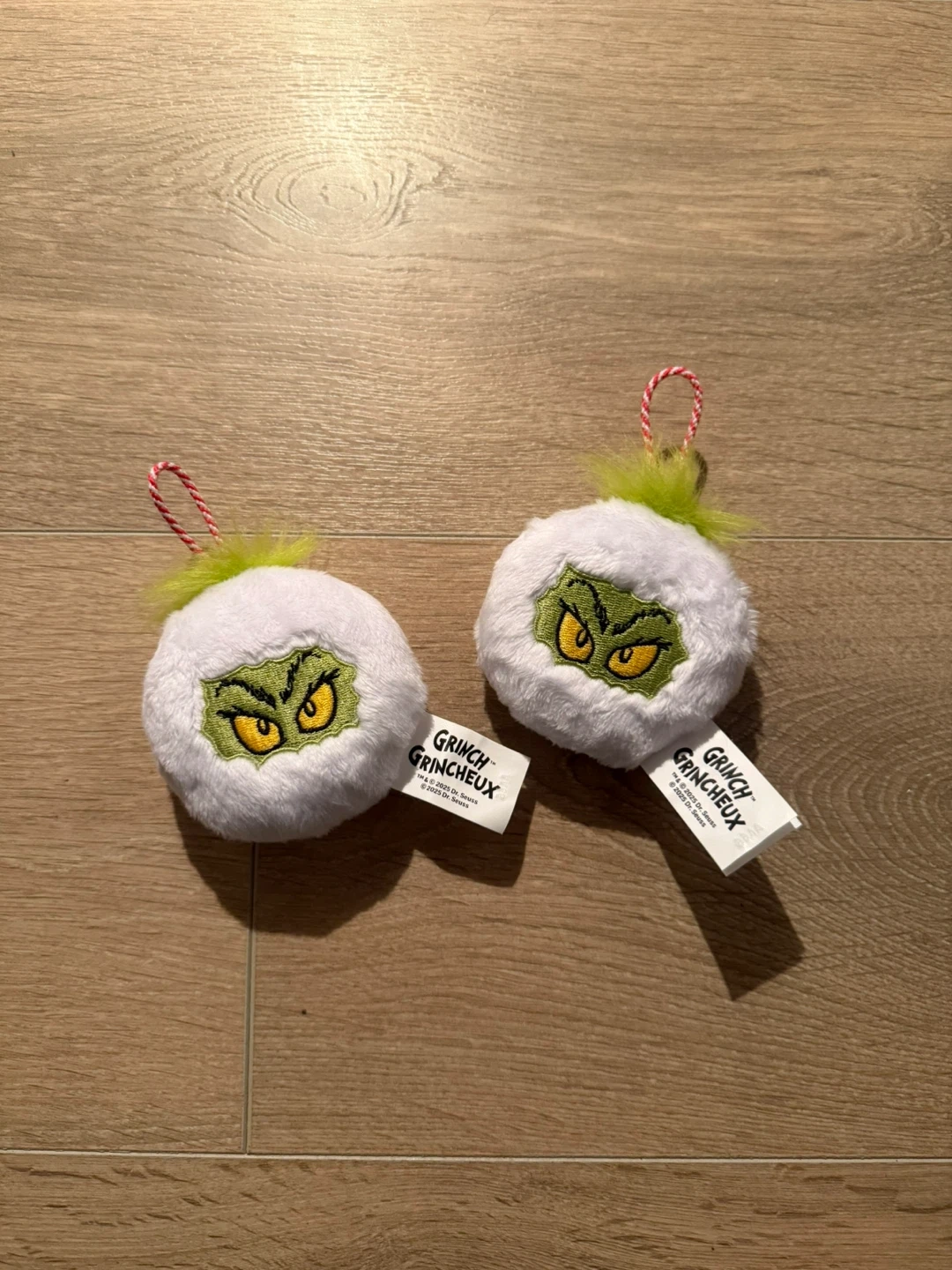 Selling two adorable Grinch plush ornaments! They're in great condition and ready to add some holiday cheer to your home. Each ornament features the Grinch's face and a cute little loop for hanging to your christmas tree 🎄.