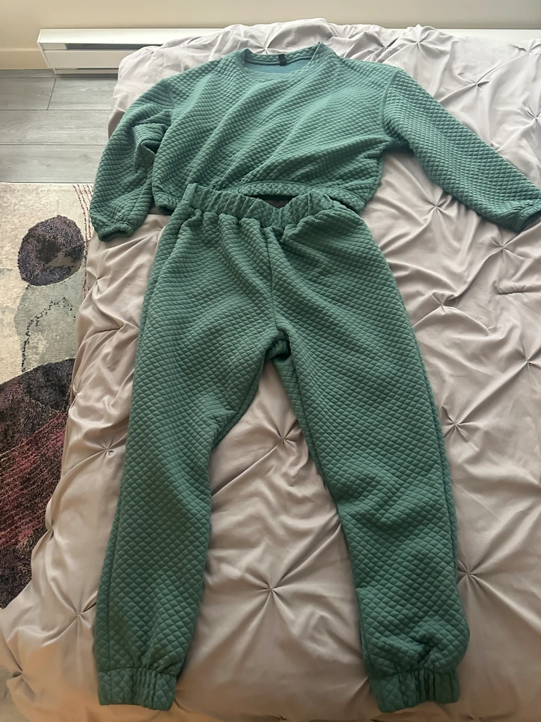 Selling a super comfy green quilted loungewear set! It's in great condition and perfect for cozy days at home or running errands. The set includes a sweatshirt and matching pants with an elastic waistband. So comfy!