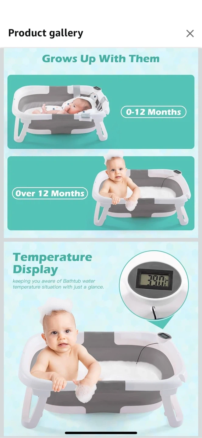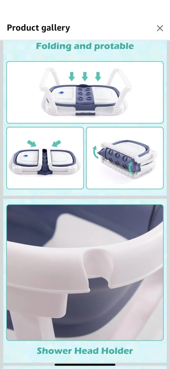 This folding baby bathtub is perfect for newborns to toddlers! It comes with a bath cushion, waterproof ear cap, and has a heat-sensitive drain plug. It's designed to be foldable and portable, making it great for small spaces or travel. The bathtub also features a shower head holder and hanging holes for easy storage. Suitable for ages 0-12 months and up!