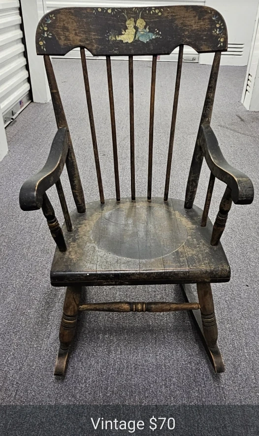 Selling a vintage wooden rocking chair. It shows signs of wear and use, adding to its rustic charm. It's a sturdy and comfortable chair, perfect for relaxing. The chair has a unique design with a painted floral detail on the headrest.
