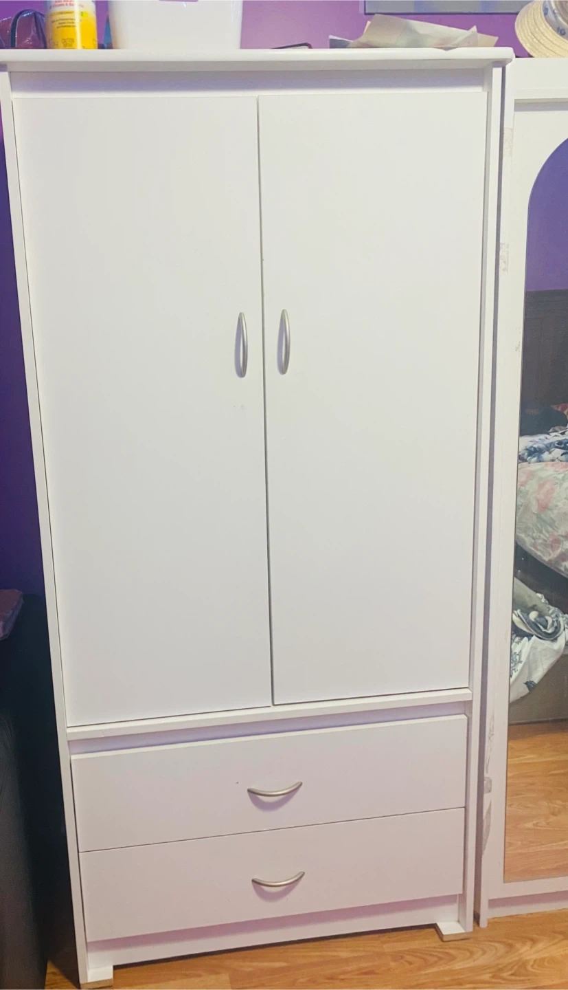 Selling a white wardrobe that's perfect for adding extra storage to any room! It features two doors up top and two handy drawers at the bottom. It's in great shape and ready for a new home.
