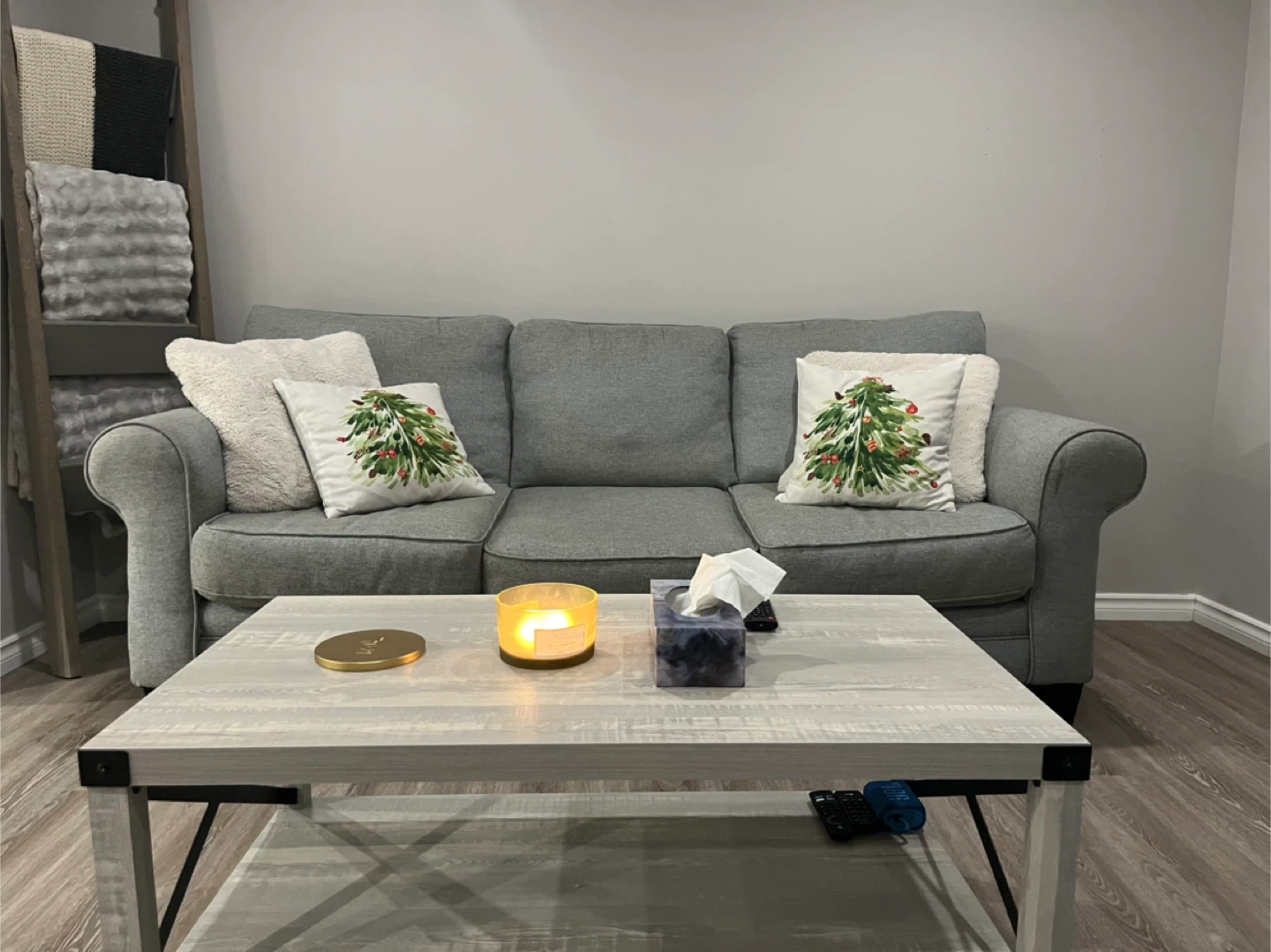 Grey couch in good condition. Has some signs of wear but no massive stains, rips, or general damage. Smoke free home.