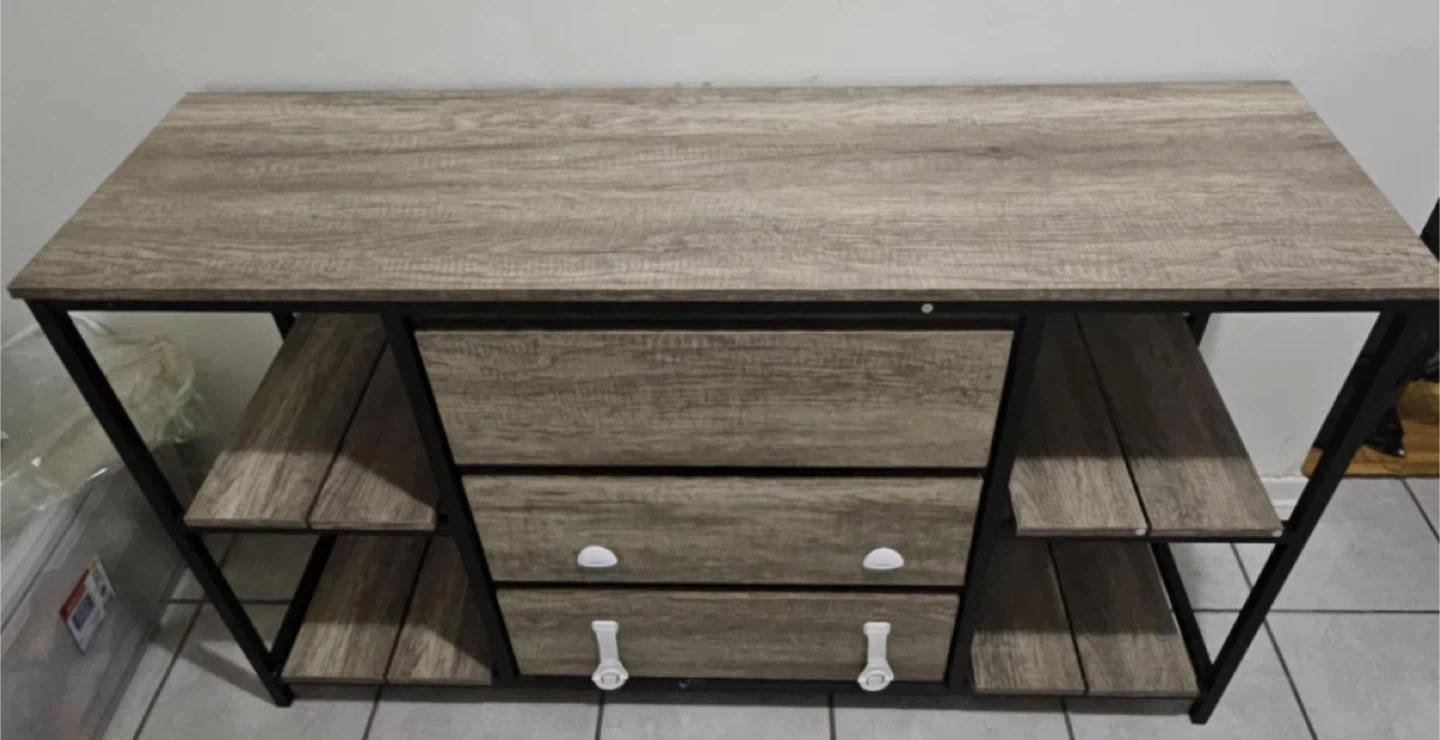 Selling a LULEA Sideboard with a wood grain finish and black metal frame. It features three drawers and open shelving on either side. The dimensions are 135.3 cm x 79.5 cm x 39.5 cm. Originally retailed for $239.