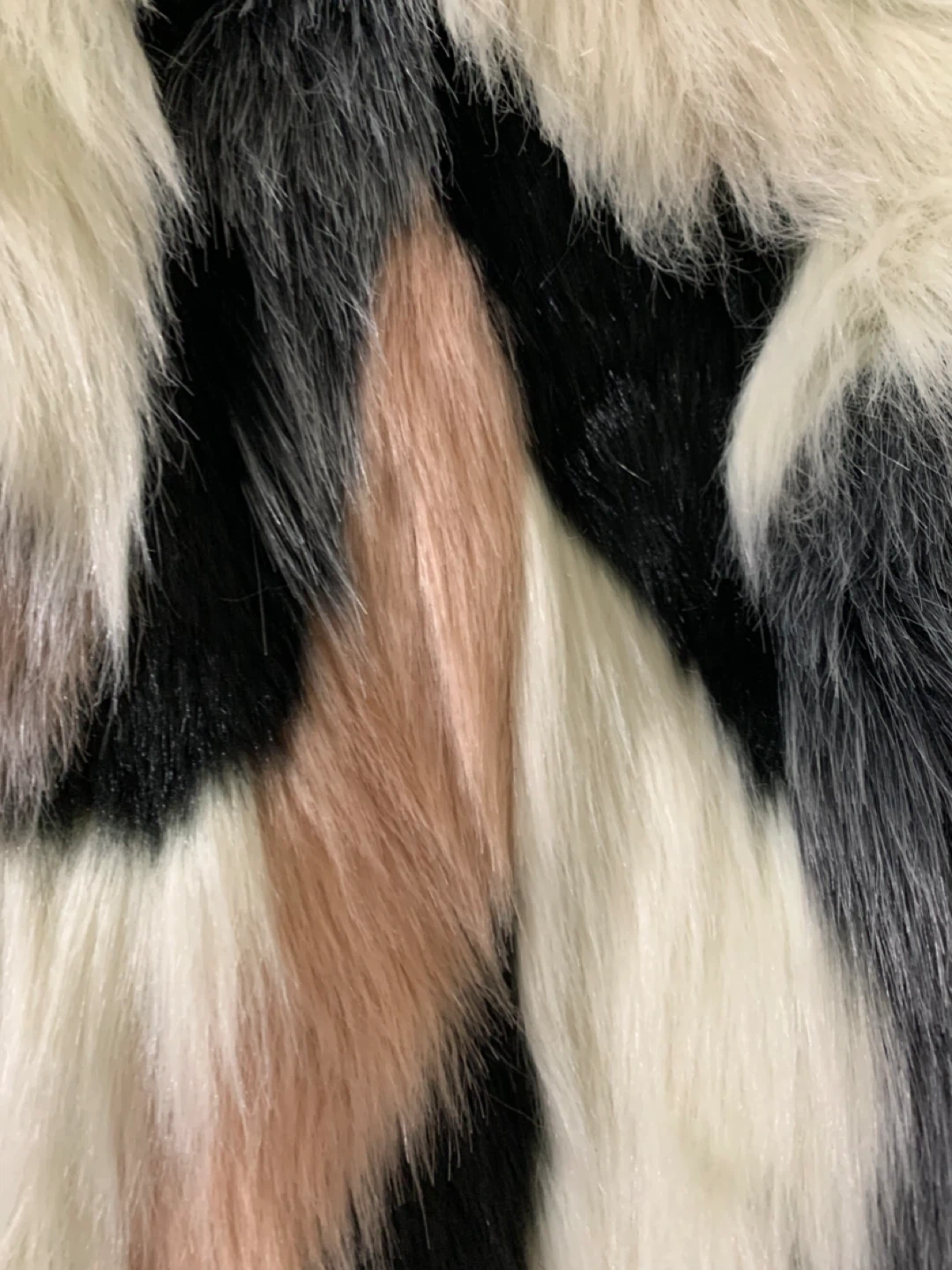 Selling a stylish faux fur coat with a unique colour block design! The coat features a mix of black, white, grey, and blush tones, making it a versatile addition to any wardrobe. It's sure to keep you warm and cozy during the colder months