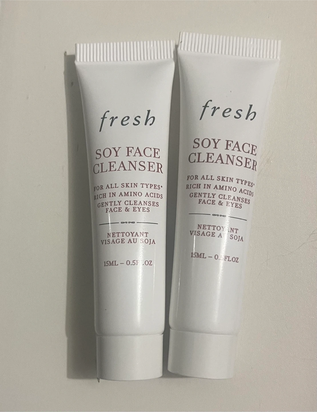 Selling two Fresh Soy Face Cleansers, each containing 15ml. These cleansers are suitable for all skin types and are rich in amino acids, gently cleansing the face and eyes
