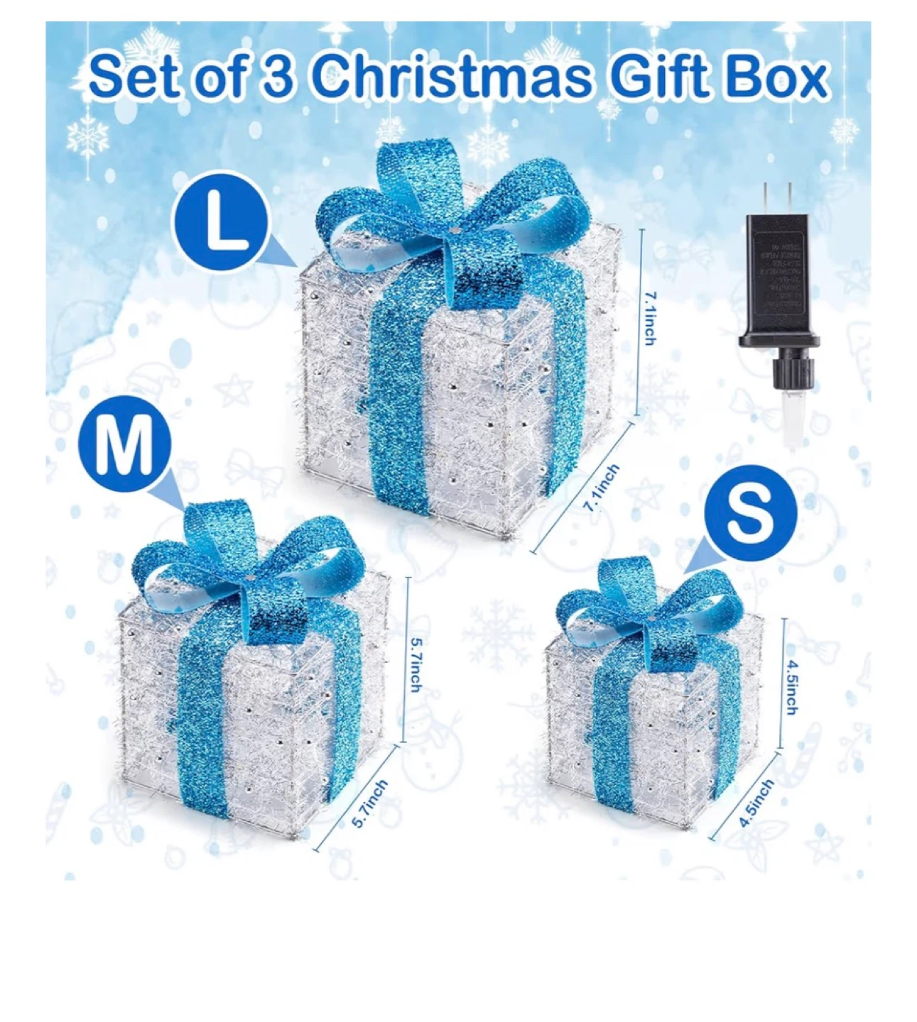 Selling a set of 3 Christmas decoration lighted gift boxes. They come with 60 LED lights and have 8 modes with a timer function. The set includes a large, medium, and small square in silver with white bows gift boxes. Please note that the required 3xAA batteries are not included. Accessories are included for one package