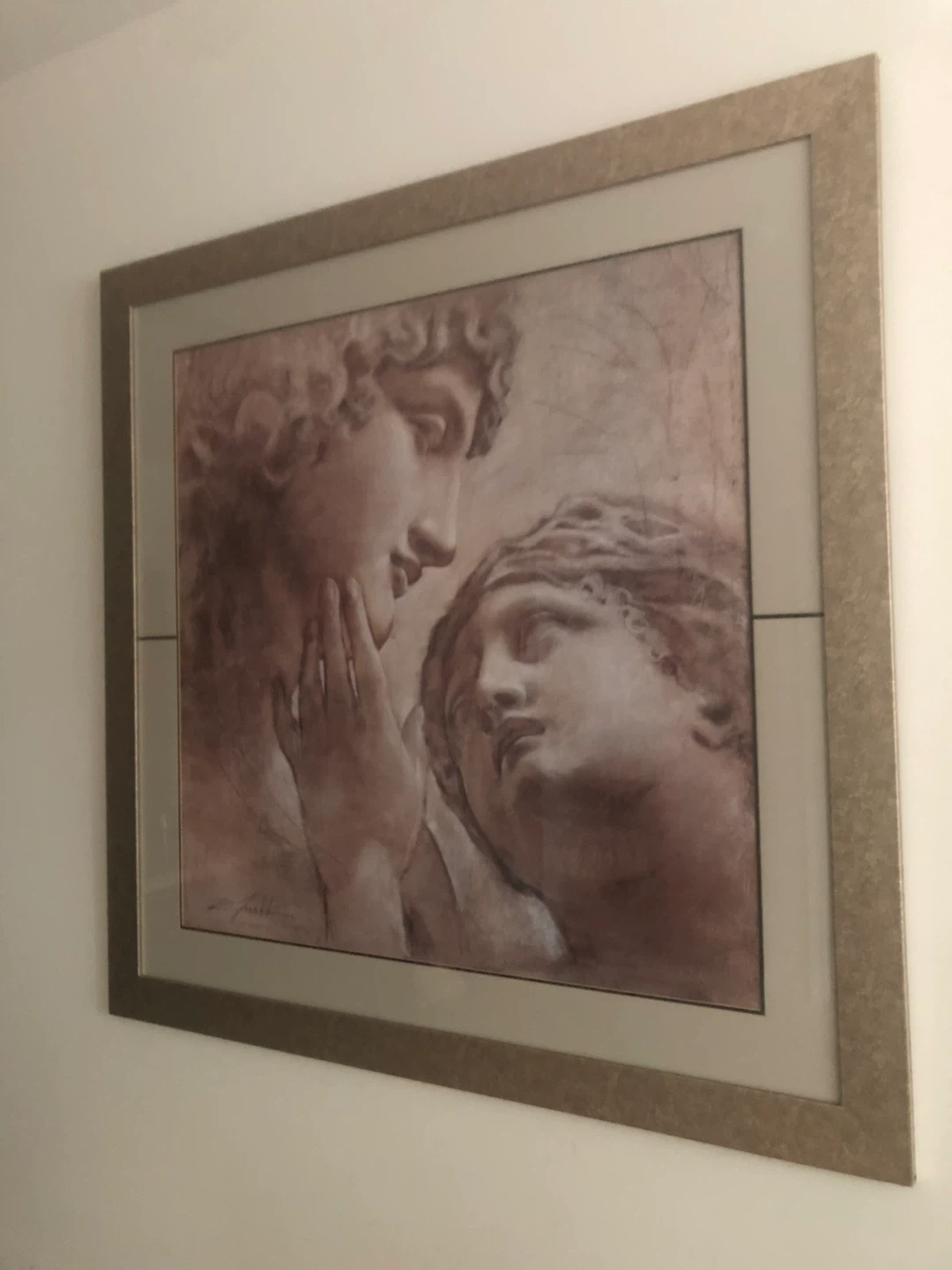 Selling a framed art print. It features a portrait of two figures in a classic style. The frame is a light gold colour. It would make a great addition to any room! Print last kiss