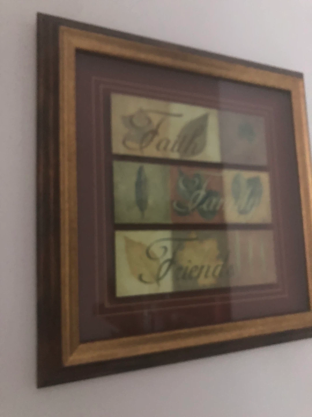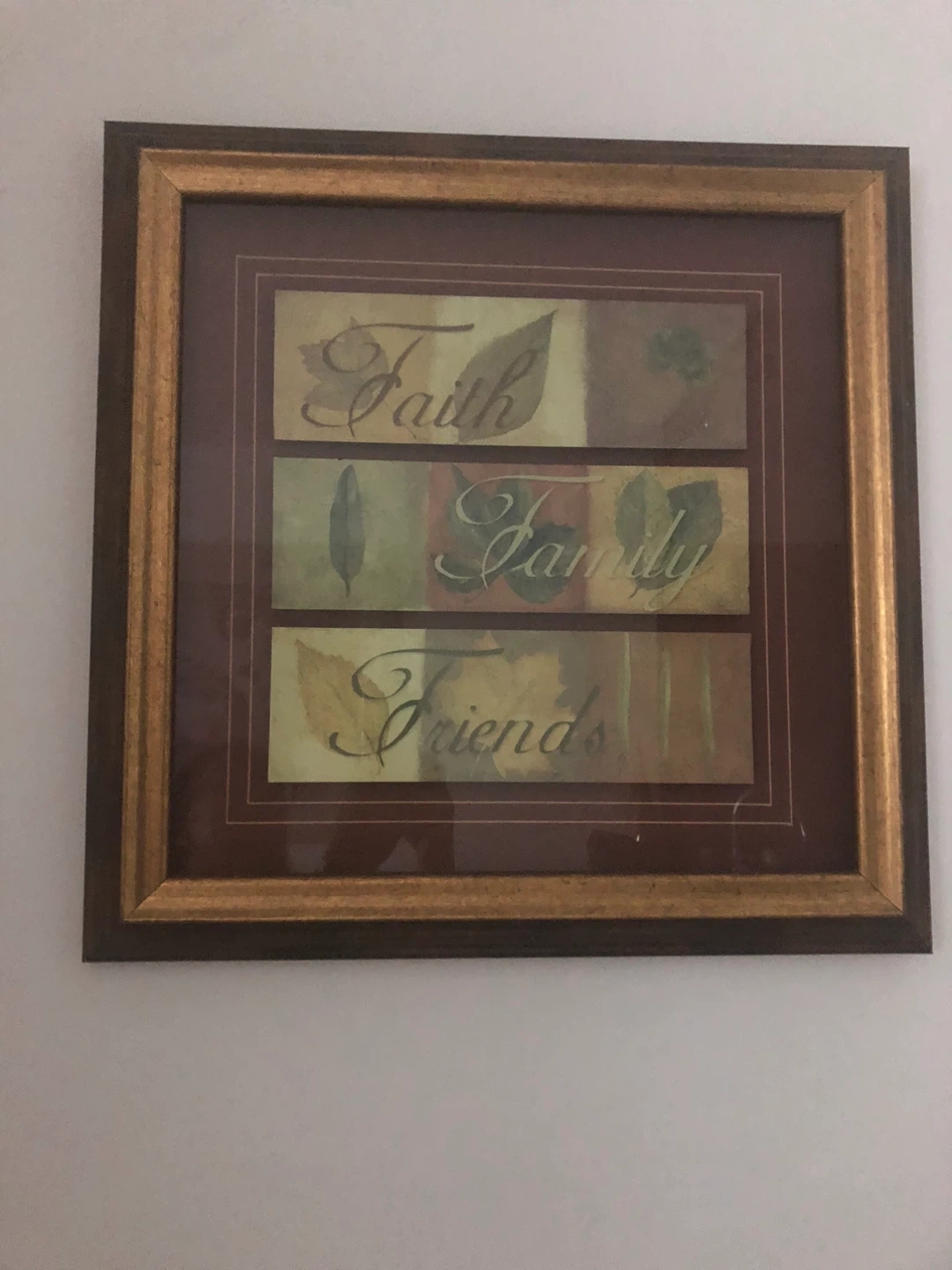 A framed piece of wall art featuring the words 'Faith, Family, Friends' in a decorative style. The frame has a gold-tone finish with a burgundy inner border. Perfect for adding a touch of warmth to any room!